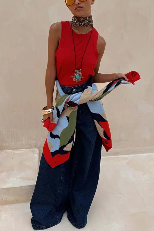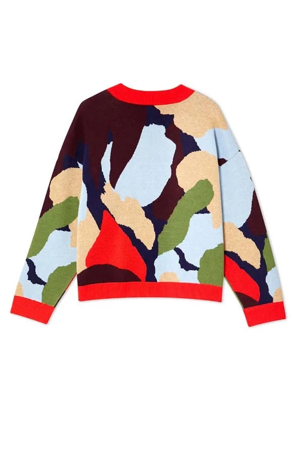 Cárdigan holgado de manga larga con botones y bloques de colores abstractos de punto brillante y atrevido