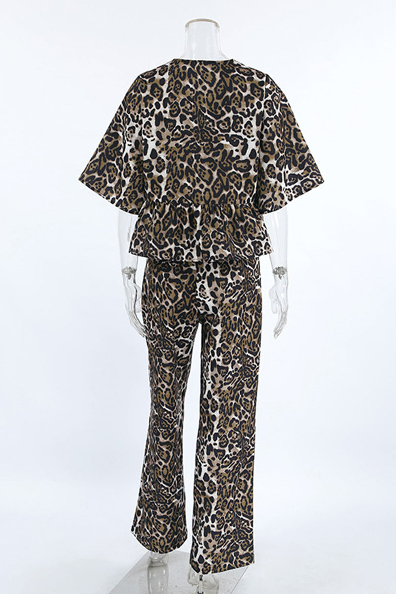 Casual Leopard Lace Up Contrast O Neck Short Sleeve Two Pieces