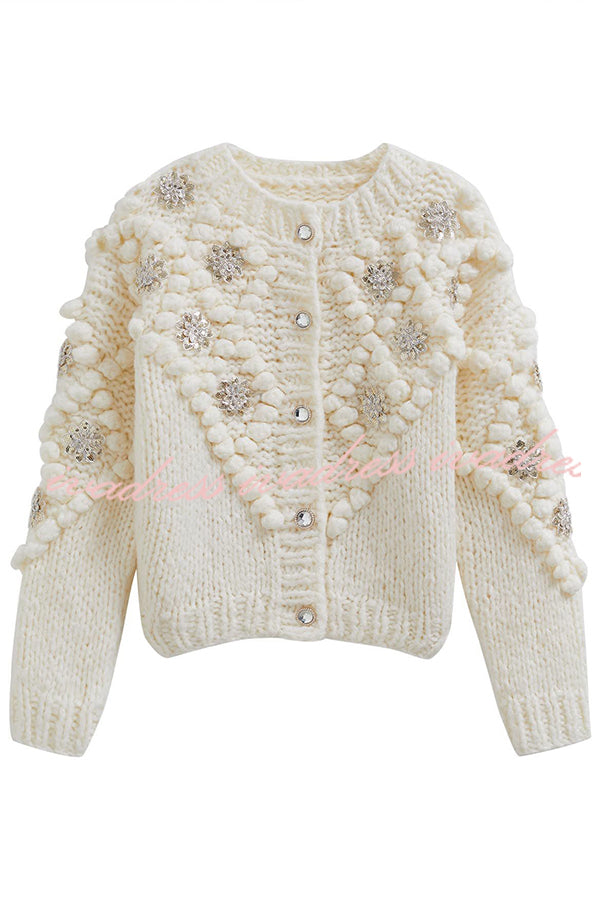 - Brilla con cada paso que das con este cárdigan. Esta encantadora prenda para combinar con otras prendas es una versión original del cárdigan clásico, con brillantes flores de lentejuelas que atrapan la luz y divertidos pompones que le dan un toque divertido. Confeccionado en punto suave y acogedor, es como un abrazo alegre en un día frío.