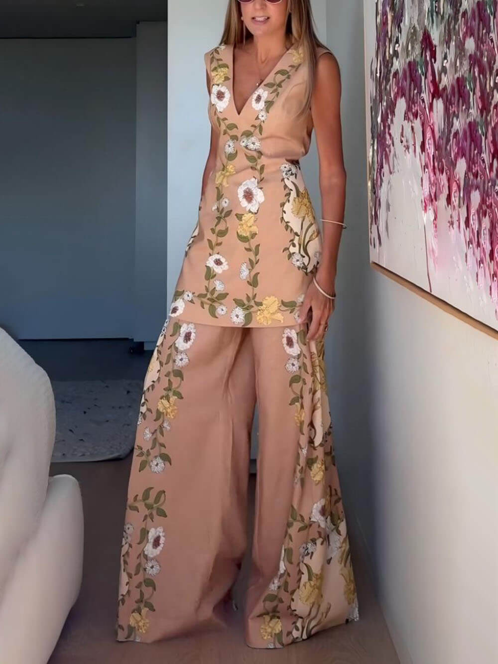Perfect for a casual outing, party or lounging at home, this top is paired with the same printed wide-leg pants, effortlessly combining style and comfort. The loose silhouette and sleeveless design provide ultimate comfort, perfect for a casual outing or beach vacation. Pair with heels and a sun hat for an easy and stylish look.