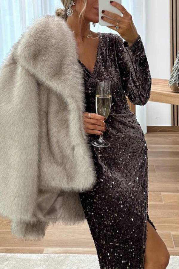 Con escote en V, mangas largas y aberturas laterales, la base de terciopelo realza la textura, mientras que las lentejuelas crean un efecto brillante con la luz. El escote en V realza el cuello y los hombros, las aberturas laterales le dan un toque sensual y atractivo, y las mangas largas lo hacen ideal para varias temporadas.