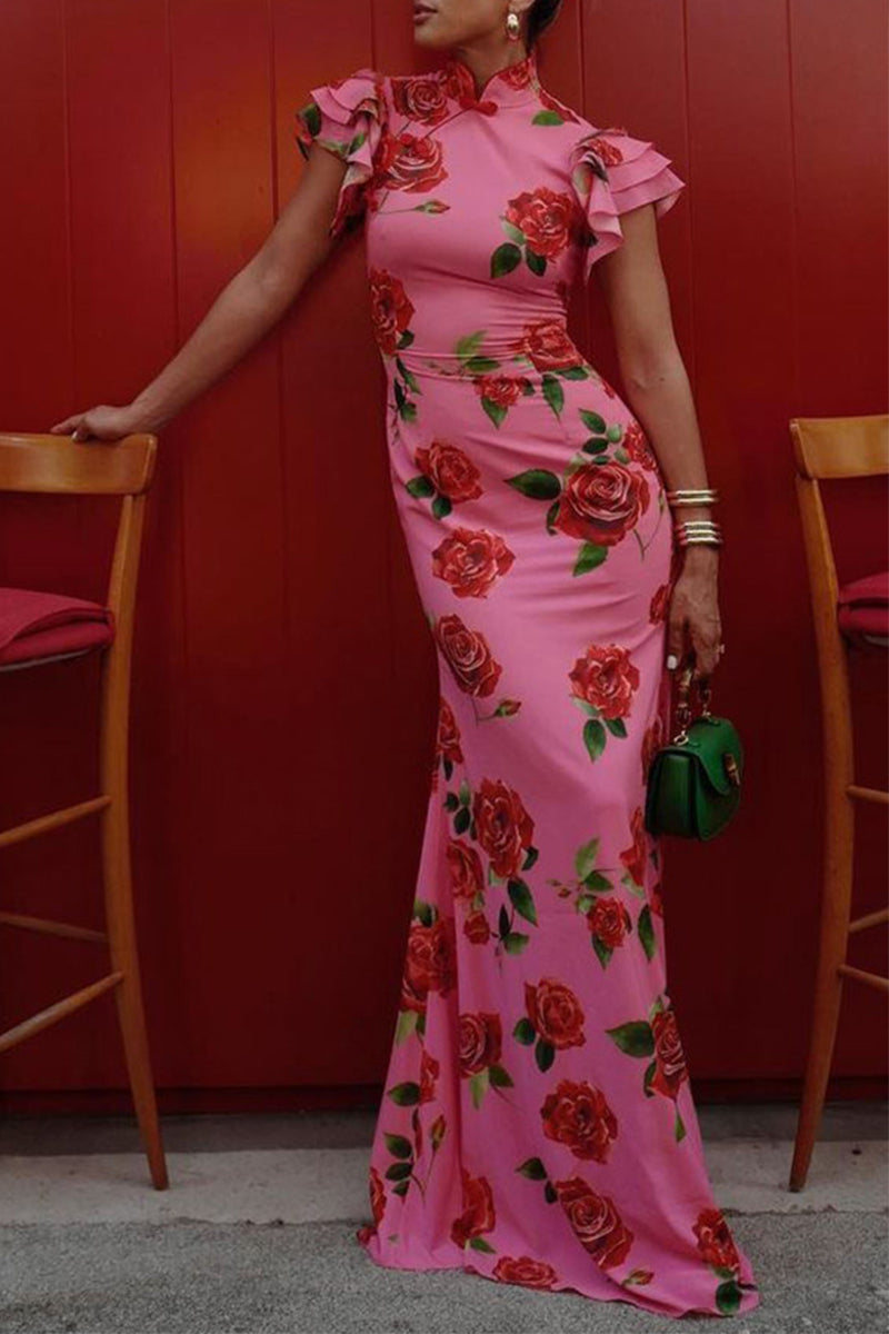 Daily Elegant Flowers Buttons Ruffle Mandarin Collar One Step Skirt Dresses