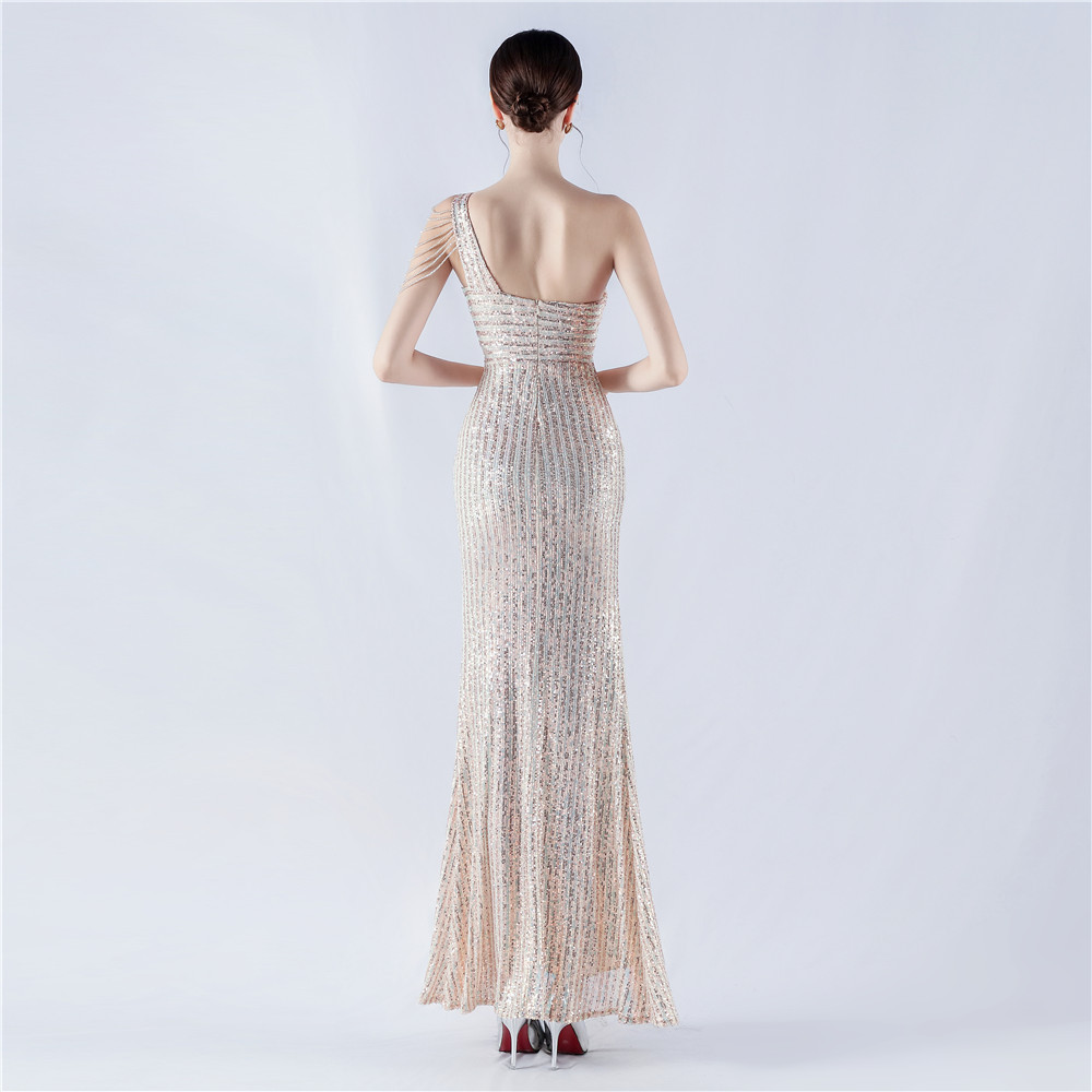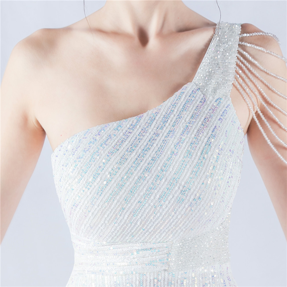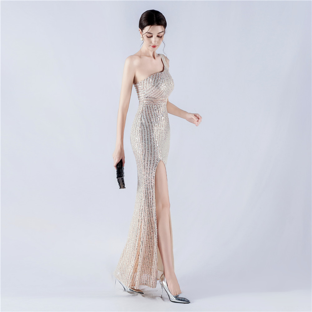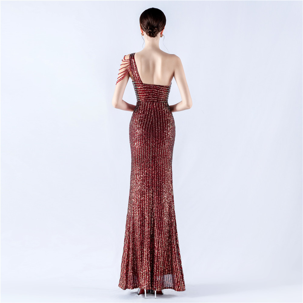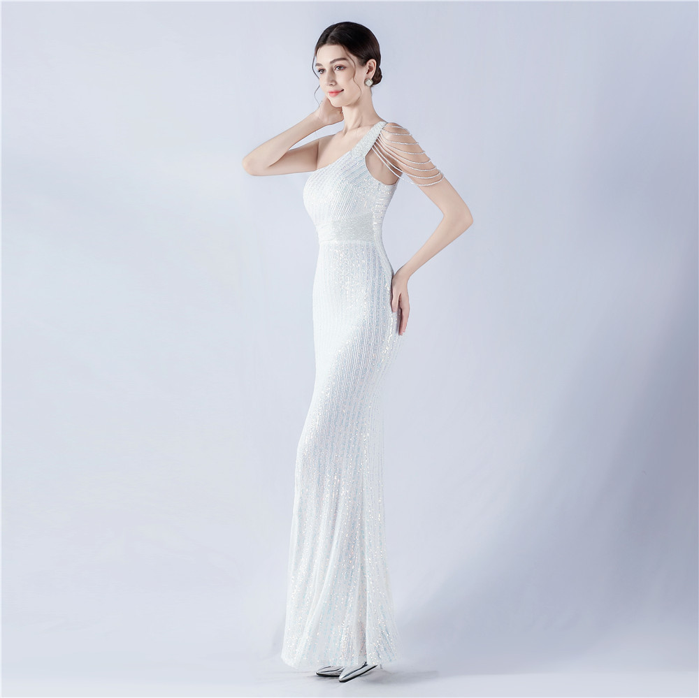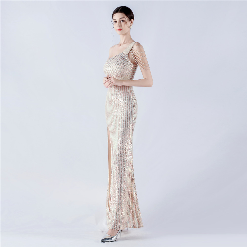 Dress Heavy Industry Beads One Shoulder Diagonal Collar High Fork Sequined Dinner Dress