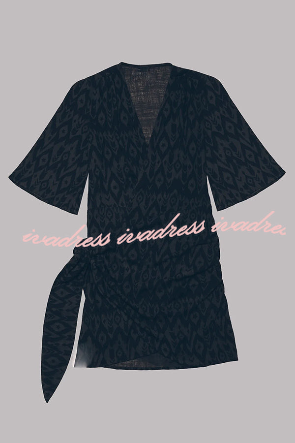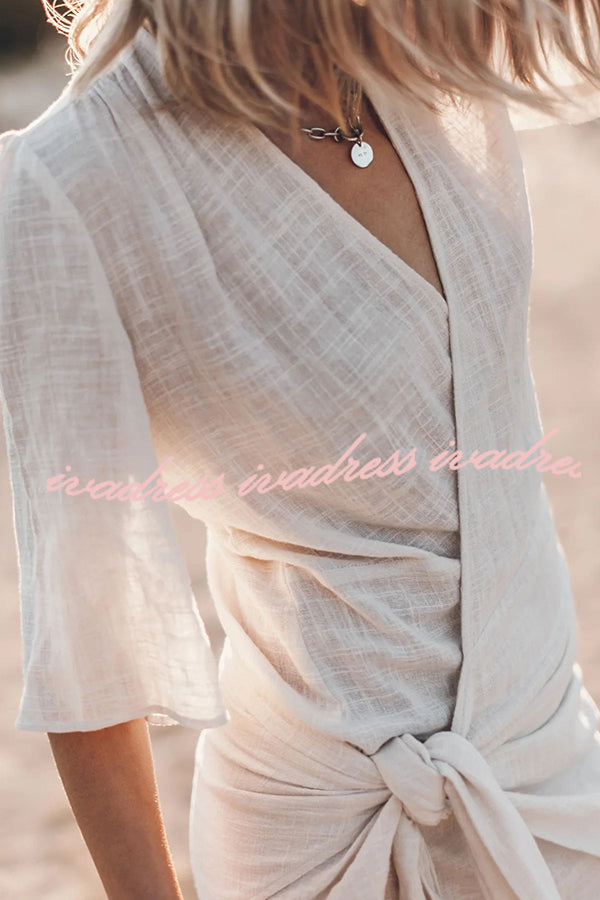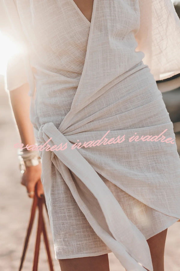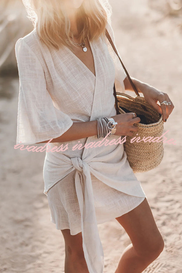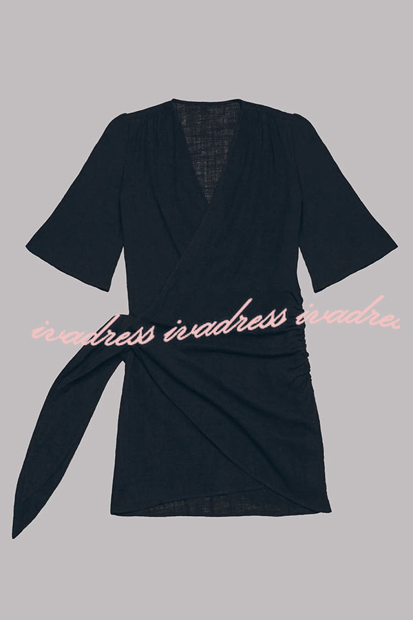 Vestido corto cruzado anudado de mezcla de lino y algodón, fácil de llevar