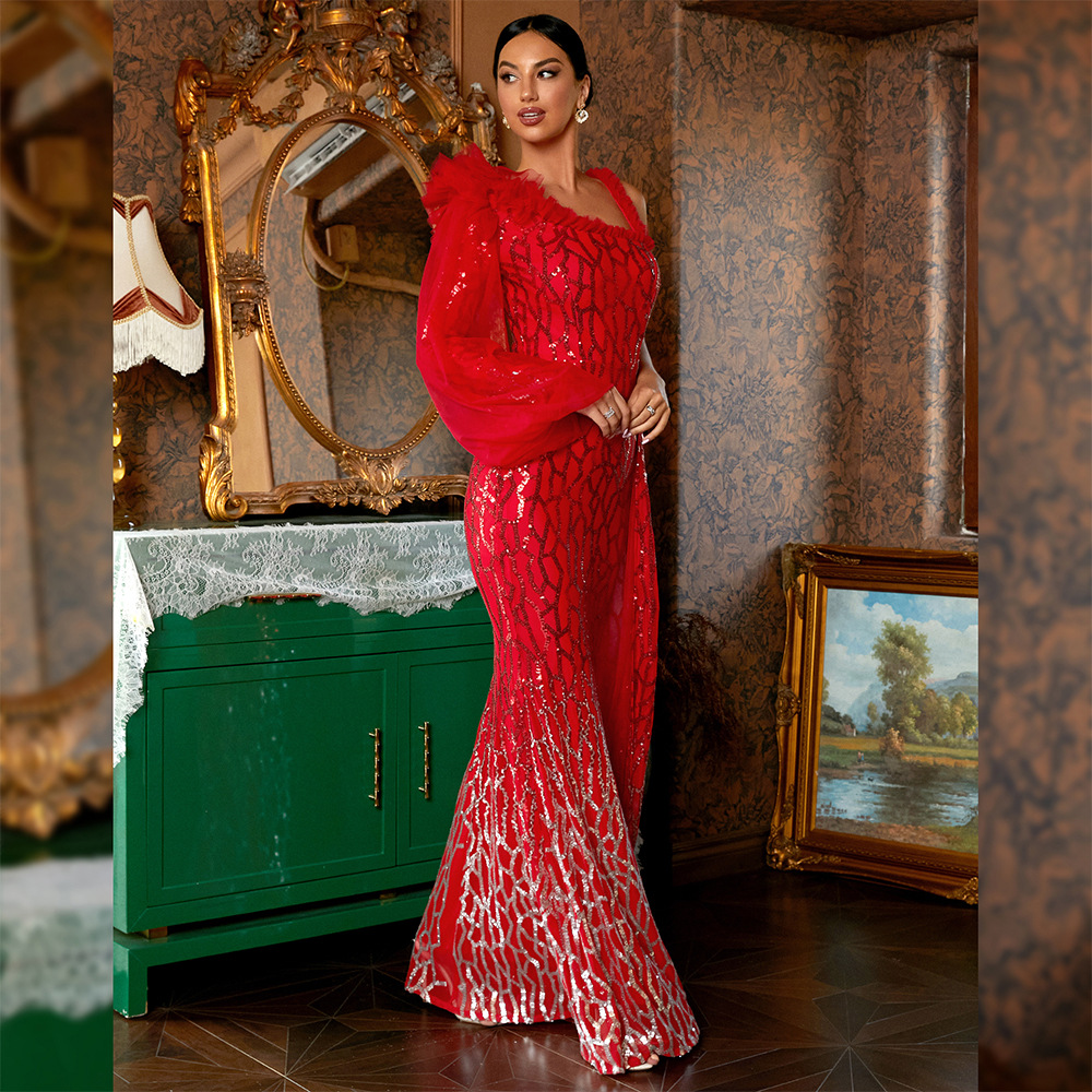Elegant Long Sequined Long Sleeve Diagonal Collar Backless Cocktail Evening Dress Bridesmaid Bodycon Maxi