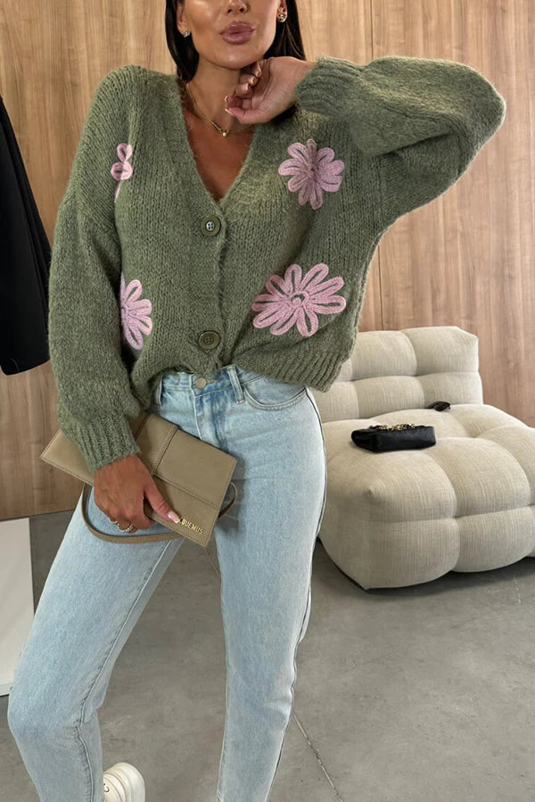 Cárdigan de punto con botones, manga larga, cuello en V y flores bordadas