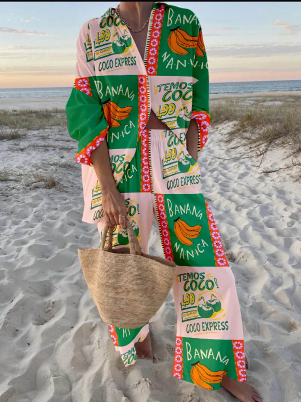 Be stylish and comfortable in our trendy banana coconut unique print long sleeve shirt wide leg pants set.