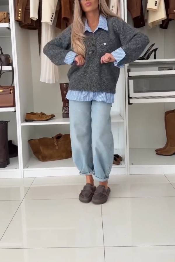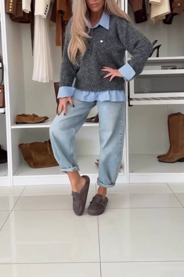 Este top de dos piezas de punto sintético presenta una capa exterior de punto con botones y una capa interior con cuello y puños camiseros. Su corte holgado e informal, su diseño sencillo pero con capas, lo convierten en una prenda básica versátil que combina con vaqueros, pantalones casuales y otras prendas. Es ideal para el día a día, para ir al trabajo y para otras ocasiones, ofreciendo practicidad y un toque de estilo.