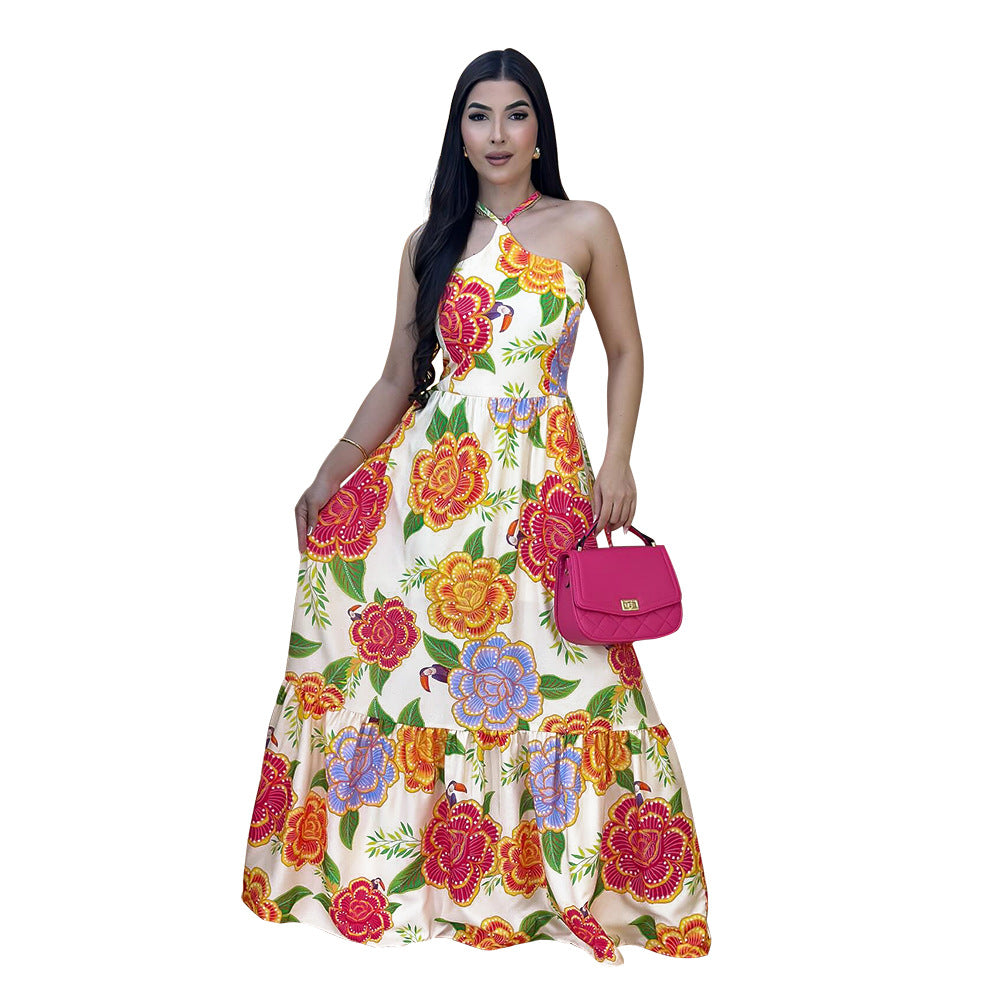 Halter Lace up Backless Dress French Printed Slim Fit Dress