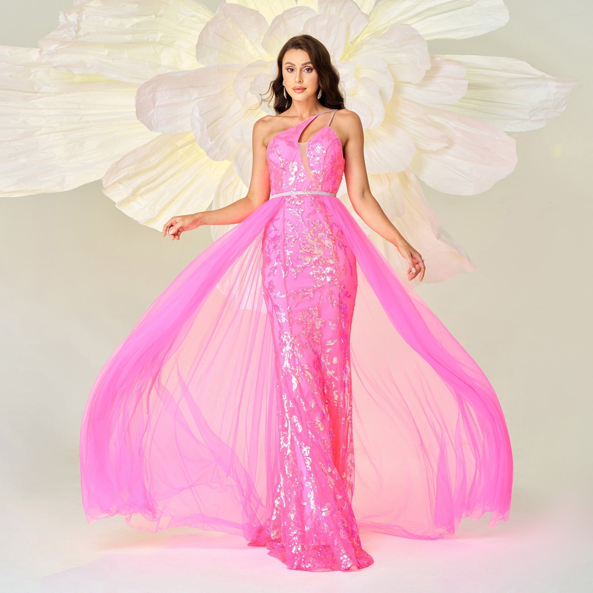 High End One Shoulder Diagonal Collar Sequin Gauze Cocktail Evening Dress Bridesmaid