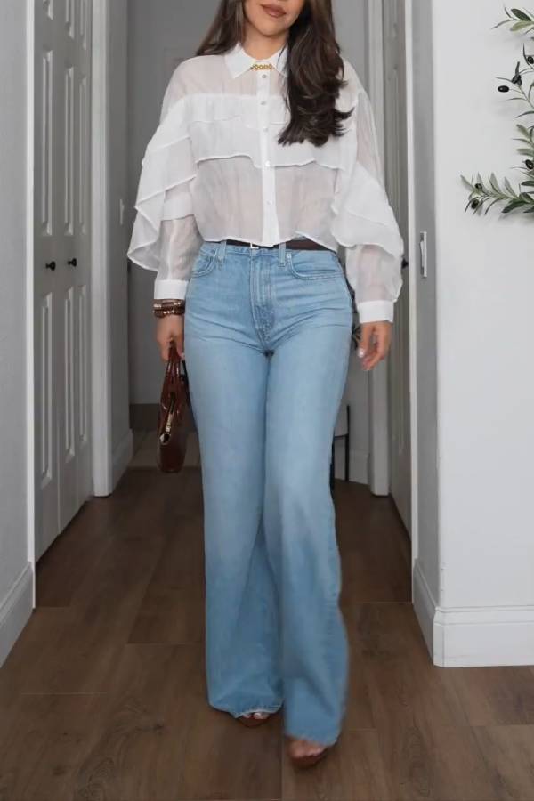 Estos jeans de tiro alto y pierna ancha están confeccionados en denim lavado azul claro. Su corte holgado ofrece comodidad y favorece las piernas. Con un estilo sencillo e informal, son ideales para diversas ocasiones, como el día a día o para ir al trabajo. Se pueden combinar con tops ajustados, crop tops y otras prendas para crear diferentes looks, convirtiéndolos en una prenda básica versátil y esencial.