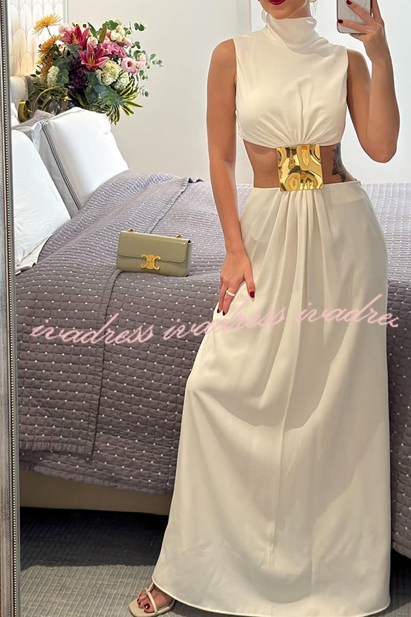 Vestido largo Avery con cuello alto, decoración metálica y cintura recortada