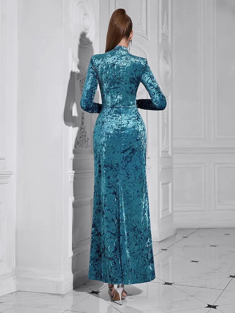 This long, minimalist dress combines elegance and sophistication. Featuring a chic high neckline, long sleeves, and subtle cutouts, it__ designed to make a statement while staying effortlessly stylish. The front slit adds allure and ease of movement, making it a must-have for any formal occasion.