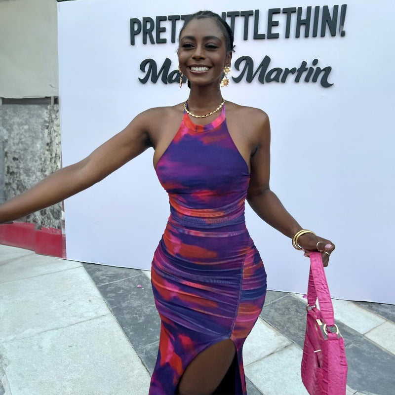 Personalized Printed Pleated Tight Backless Halter Split Dress