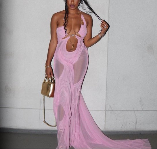 This wetlook dress is intricately draped to create the ethereal illusion of water rippling across the body.