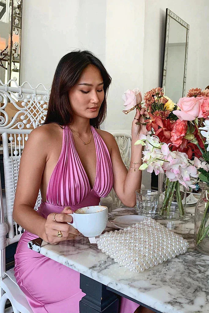 We present to you her “Marylineâ€?dress designed with a V-neck and an open back. It features halter straps.