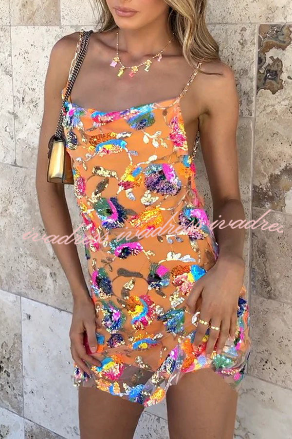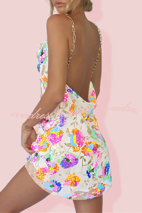 Vestido mini de corte A con cuello redondo, espalda descubierta, lentejuelas y flores con cadena