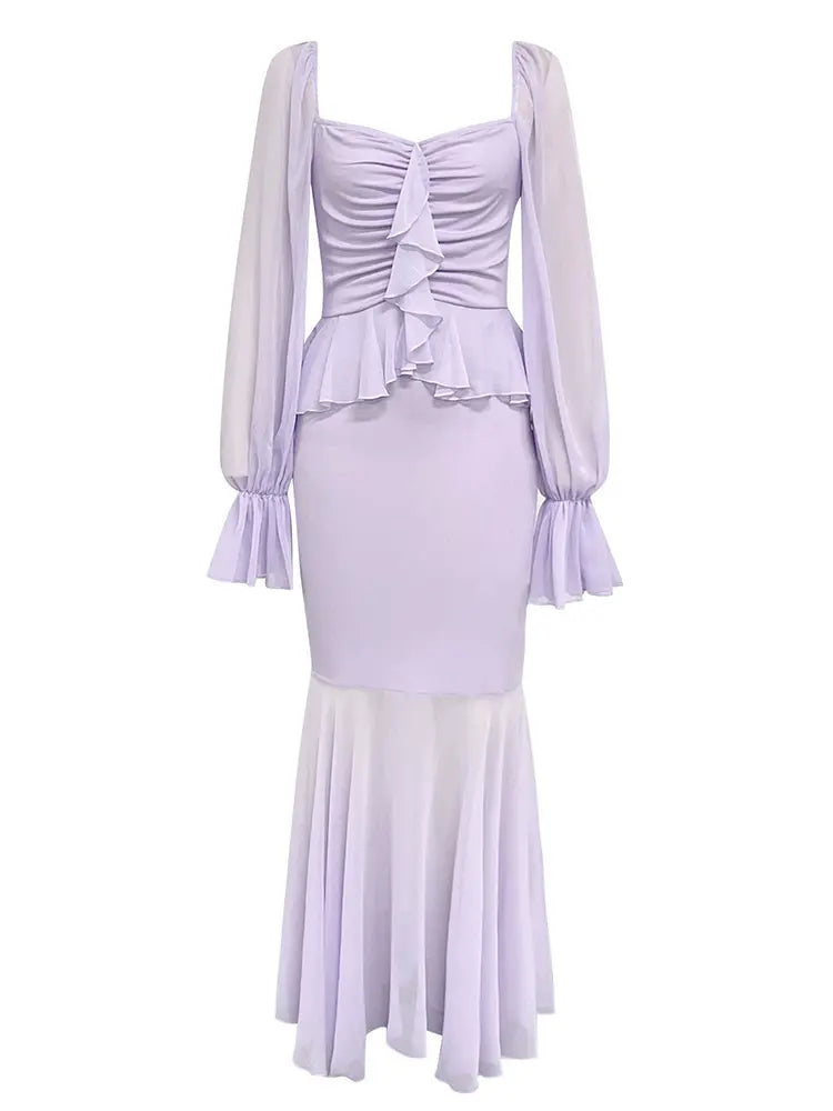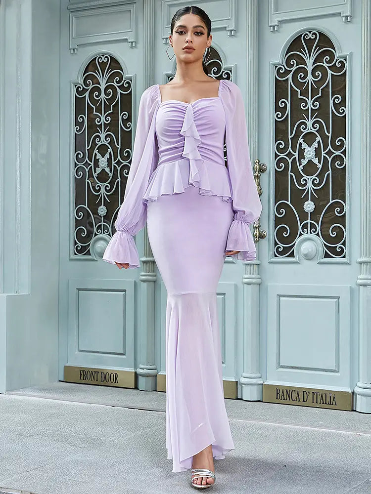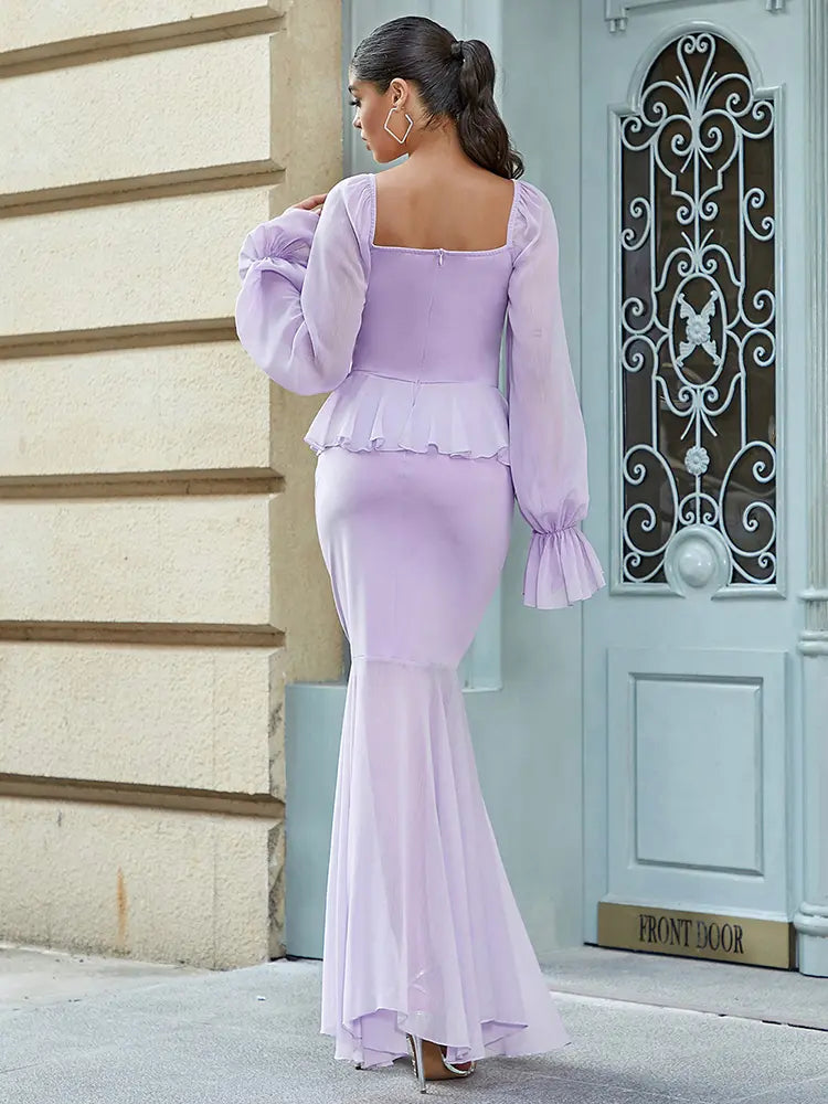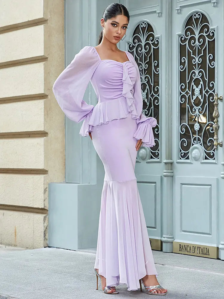This stunning dress blends femininity and sensuality in one perfect piece. Featuring a flattering bustier-style bodice with a delicate ruffle flower detail, this dress exudes elegance. The puffed princess sleeves add a vintage touch, while the chiffon fabric ensures a lightweight and airy feel. The dress hugs the waist and flows gracefully down, creating a slimming silhouette. It's an ideal choice for anyone looking to make a statement while embracing chic, romantic style.