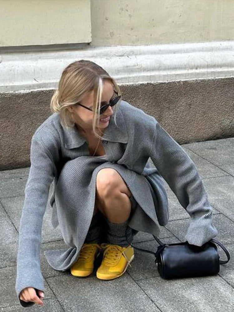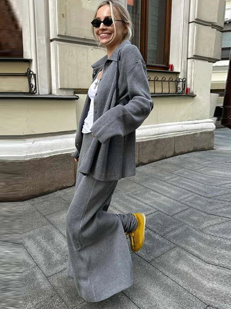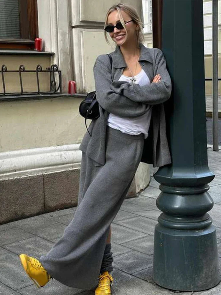 The Shiloh Three Piece Set offers versatile autumn style with its button jacket, loose pants, and hip-hugging skirt. Crafted from a comfortable knit fabric, this set effortlessly combines elegance with casual charm. Perfect for the fashion-forward woman looking to elevate her wardrobe.