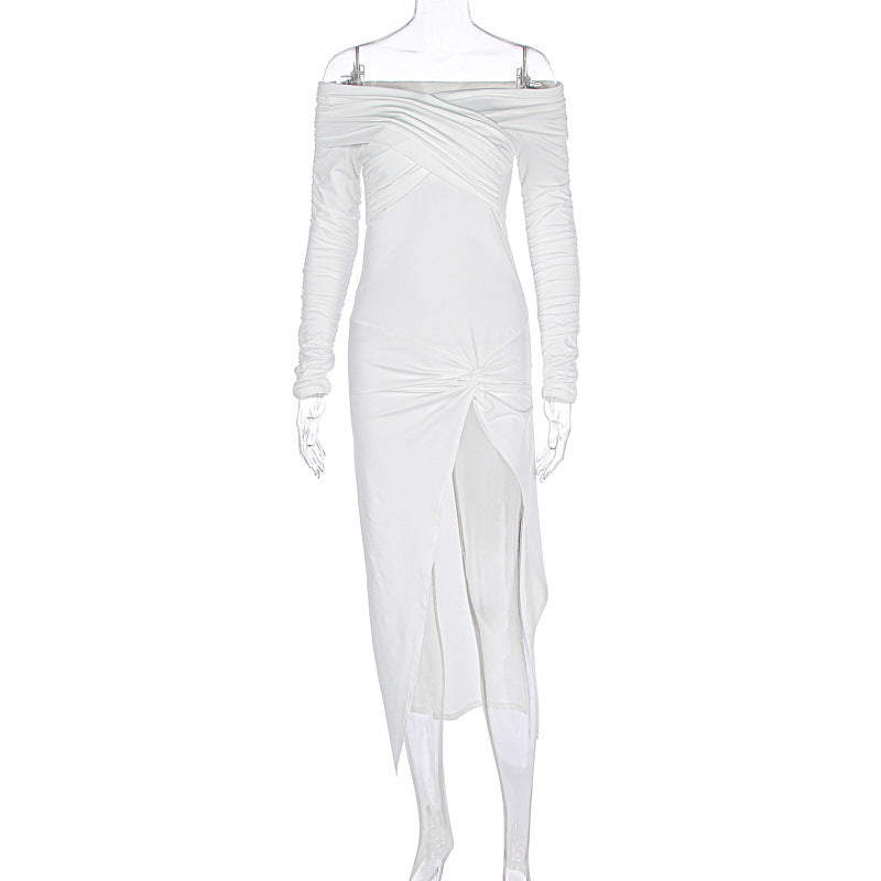 Solid Color off the Shoulder Tube Top Split Pleated Long Sleeve Dress