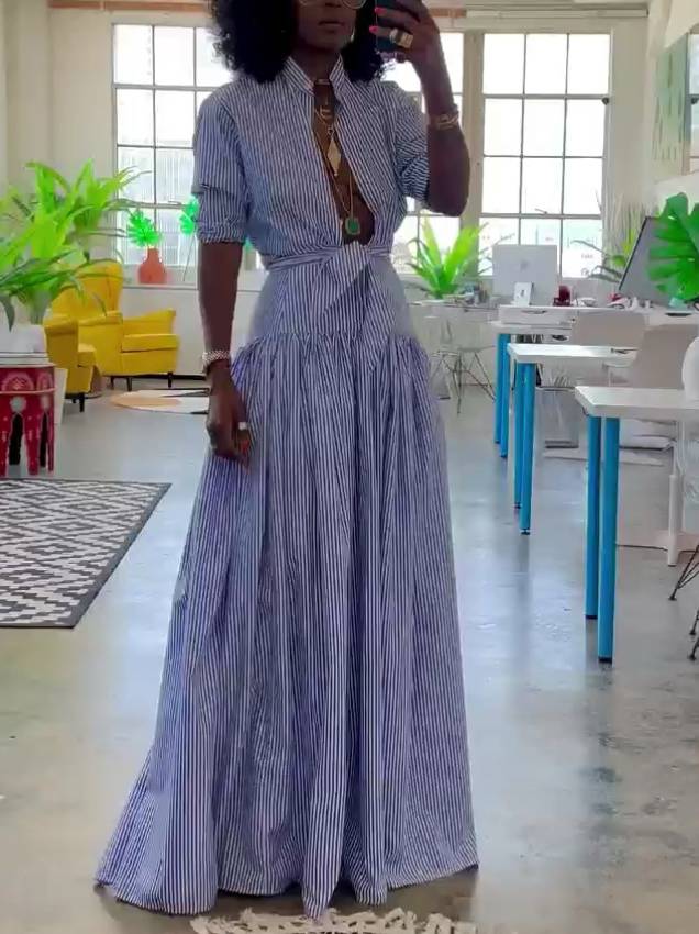Striped Stand Collar Shirt And Skirt Suit-Shirt