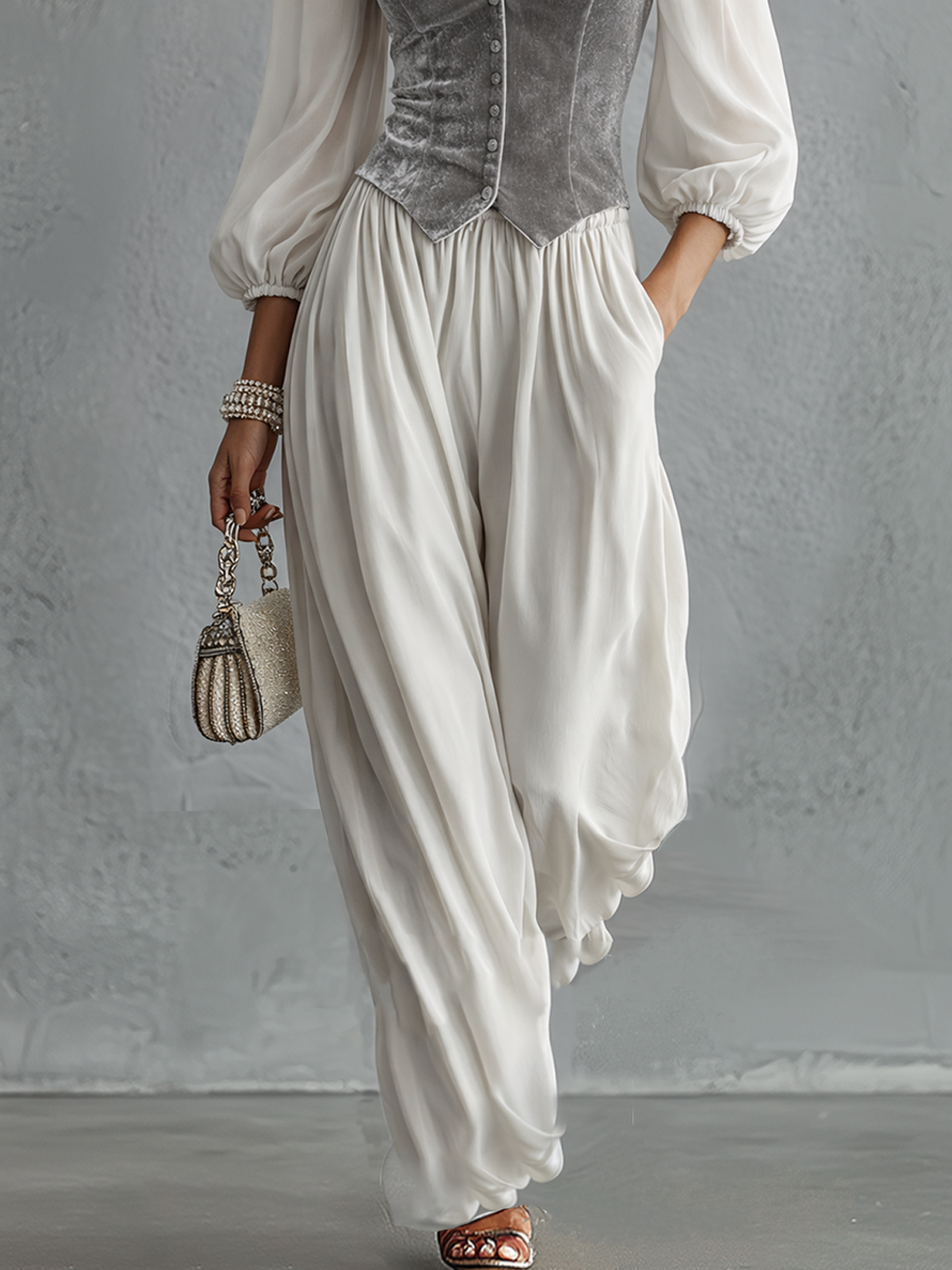 - Design: This two-piece ensemble features a tailored, corset-style vest with a deep V-neckline and button-front closure paired with billowing high-waisted trousers. The gathered sleeves and draped pants silhouette create an elegantly relaxed yet tailored aesthetic that exudes timeless refinement.