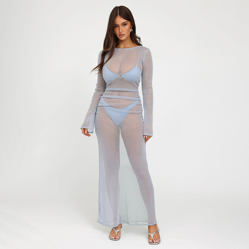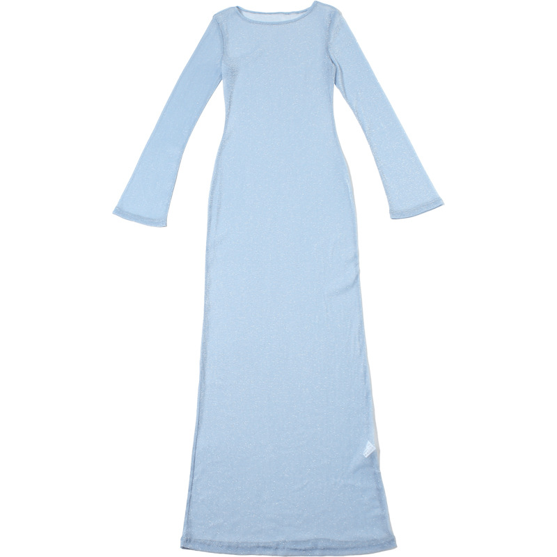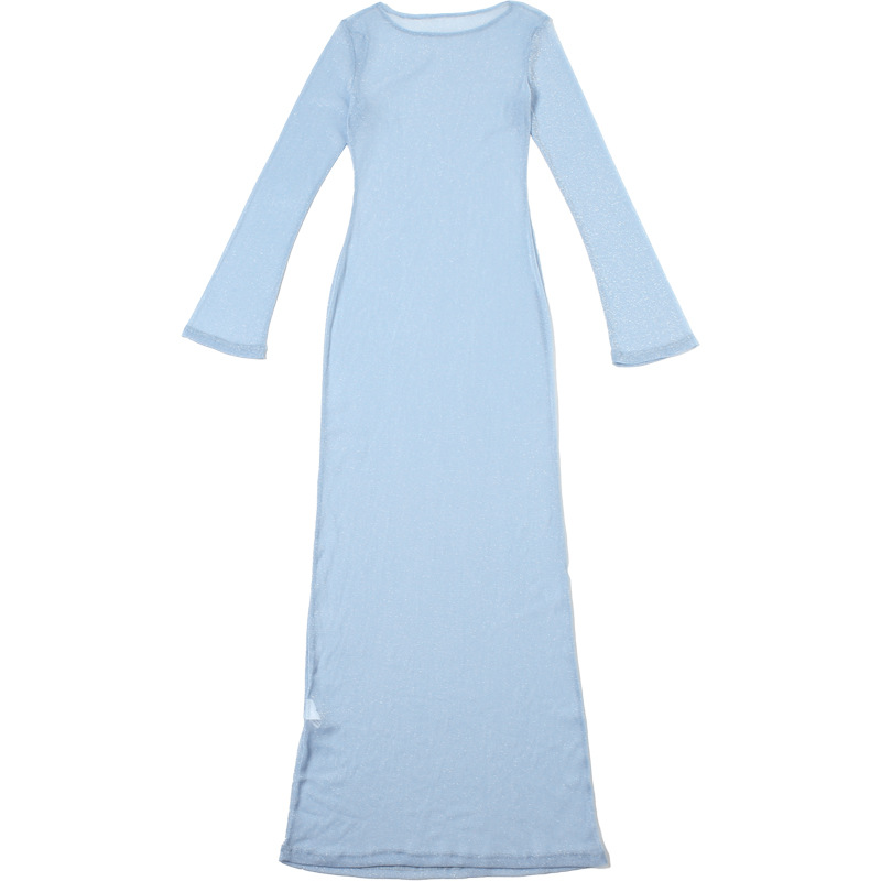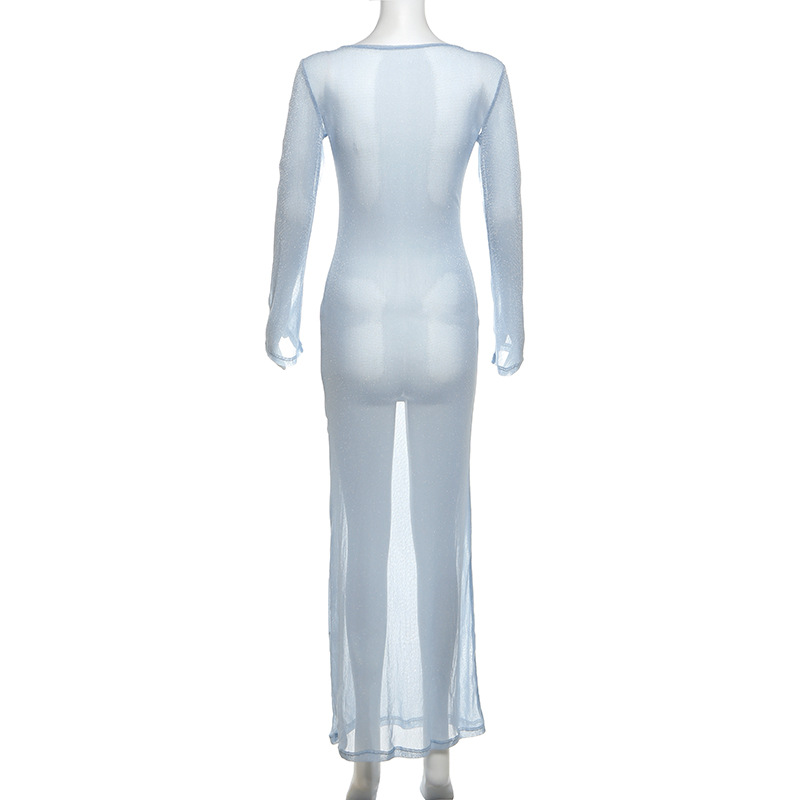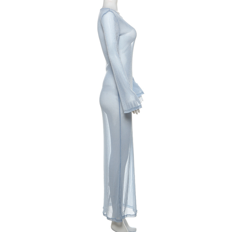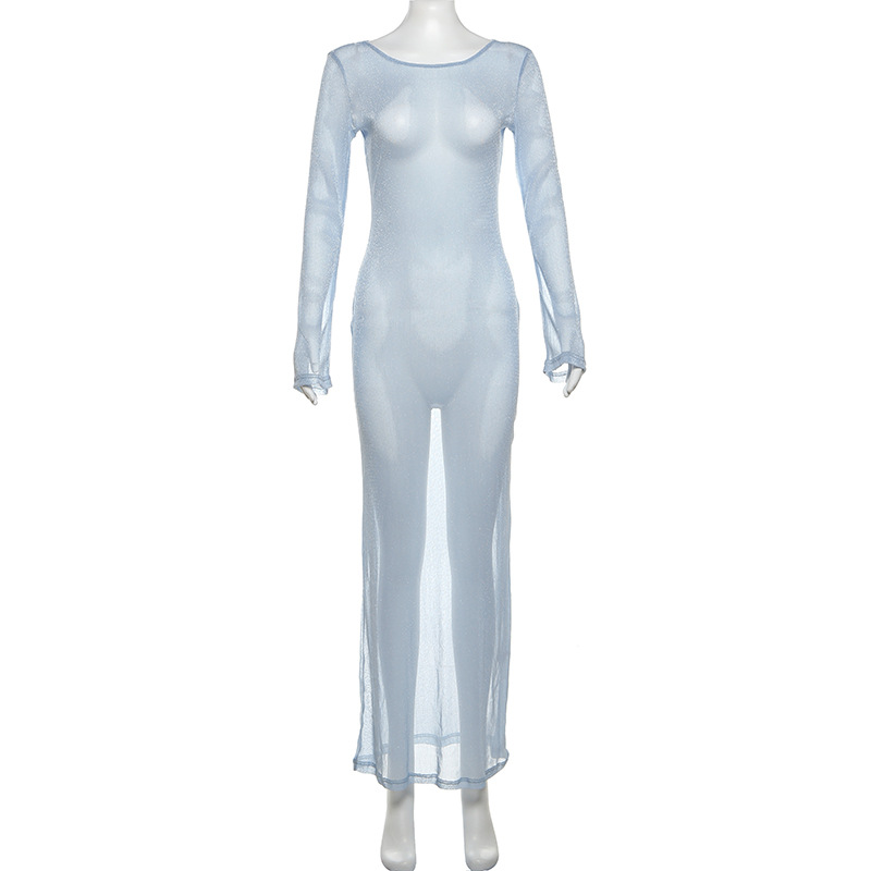 Wear Personality Round Neck Slim Fit Maxi Dress See Through Long Sleeves Dress