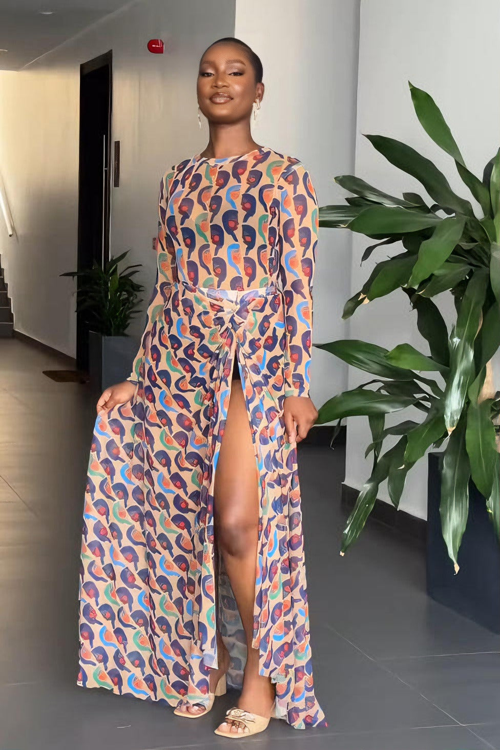 This abstract portrait-print maxi dress is a bold celebration of artistic expression and modern femininity. The long-sleeve bodice fits closely to the body, featuring a high crew neckline, while a dramatic front knot detail creates flattering ruching and flows into a high-slit skirt that reveals subtle leg movement with every step. The all-over print showcases stylized female faces in vibrant pops of blue, red, green, orange, and navy against a warm beige base—turning the wearer into a walking gallery piece. Lightweight and flowing, it’s perfect for art openings, cocktail events, daytime weddings, or any occasion where standout style is essential. A versatile spring-to-fall favorite with effortless sophistication.