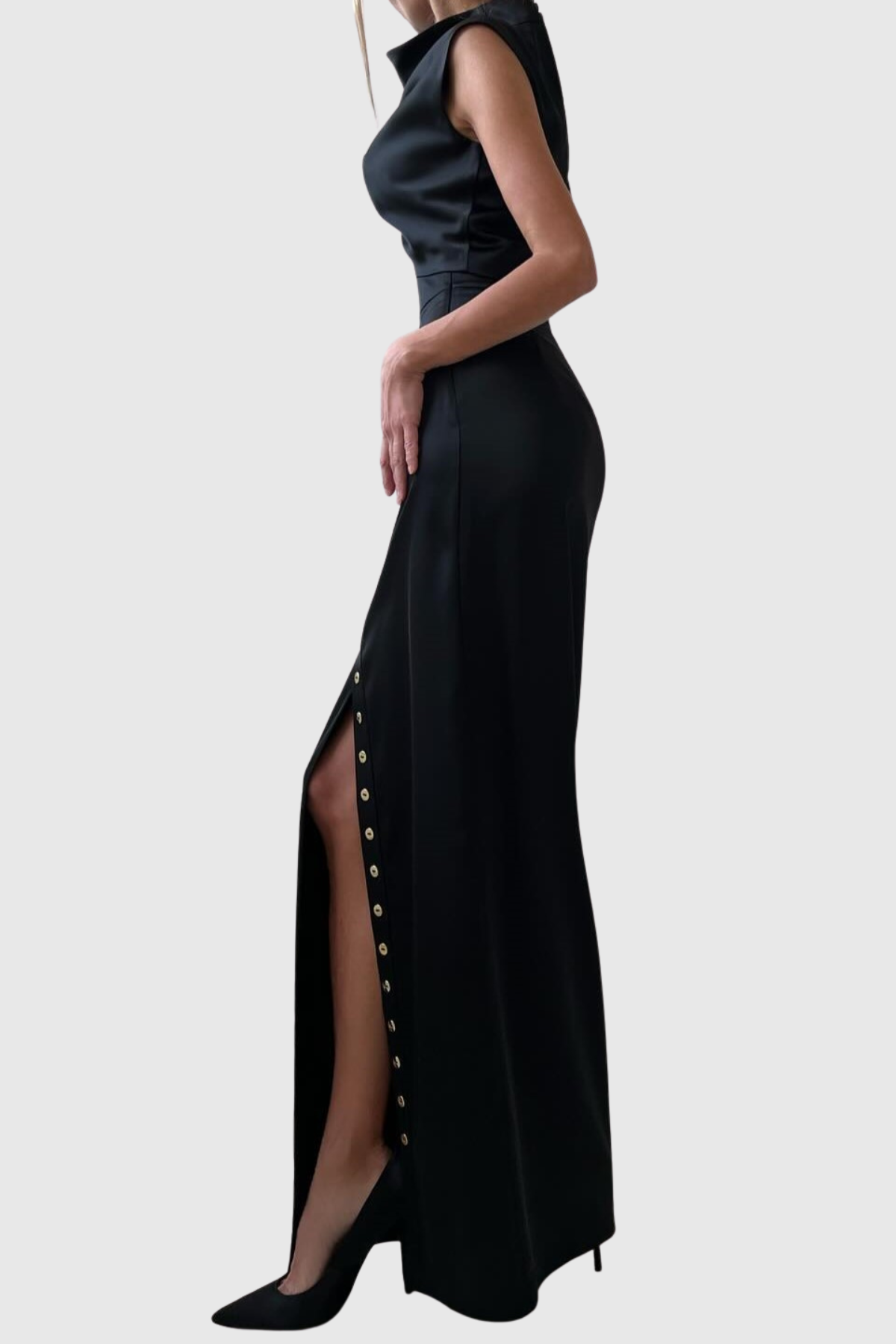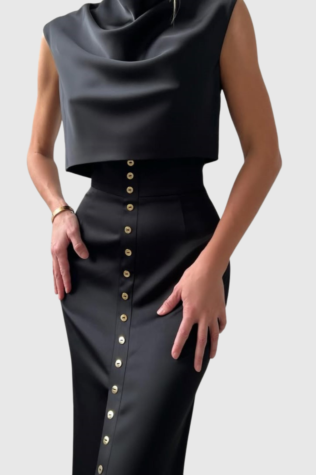 Airlie Satin Top & Buttoned Skirt Set - Black