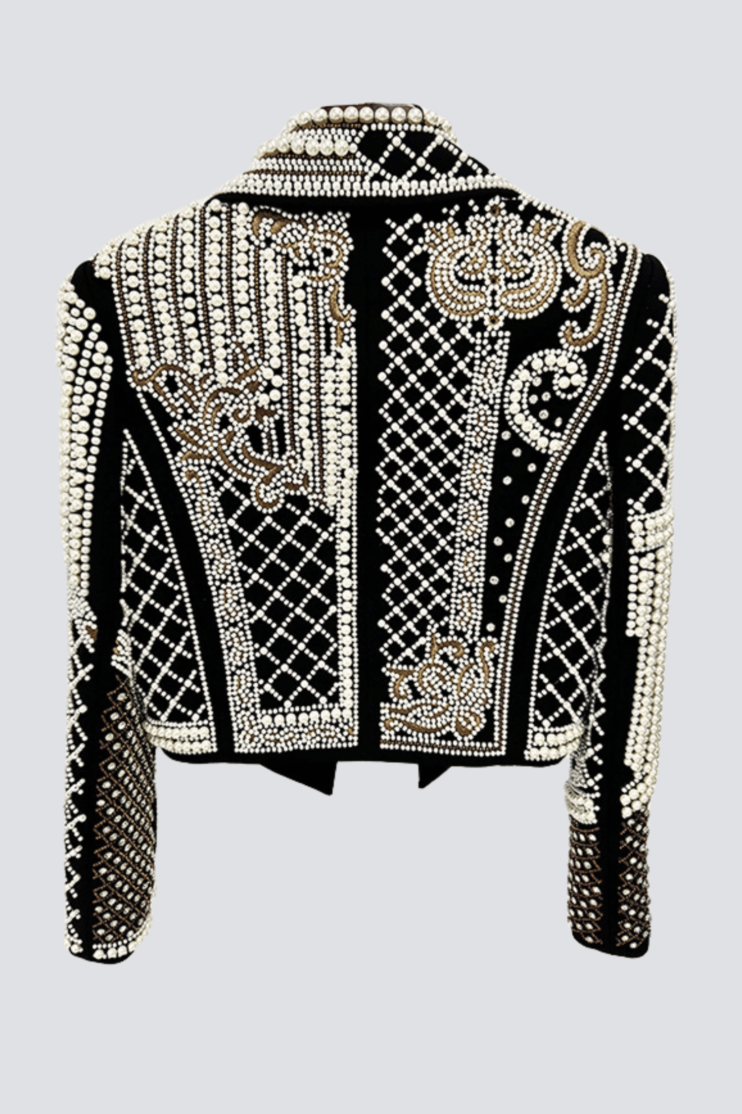 Indulge in the ultimate luxury with our Akili Pearl Embellished Cropped Blazer. This exclusive piece is adorned with delicate pearls, adding a touch of elegance to its cropped silhouette. Elevate any outfit and make a statement with this sophisticated and timeless piece.