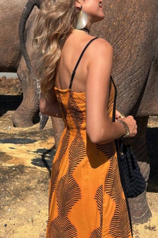 Long dress with straight neckline, adjustable thin straps, A-line skirt, elastic back with honeycomb