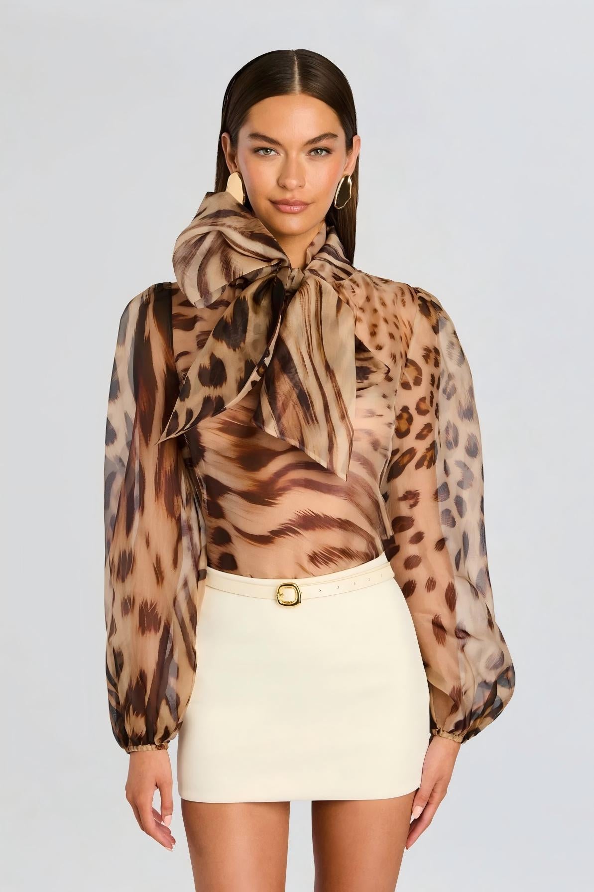 Animal Print Sheer Blouse – Bow Tie Neck
