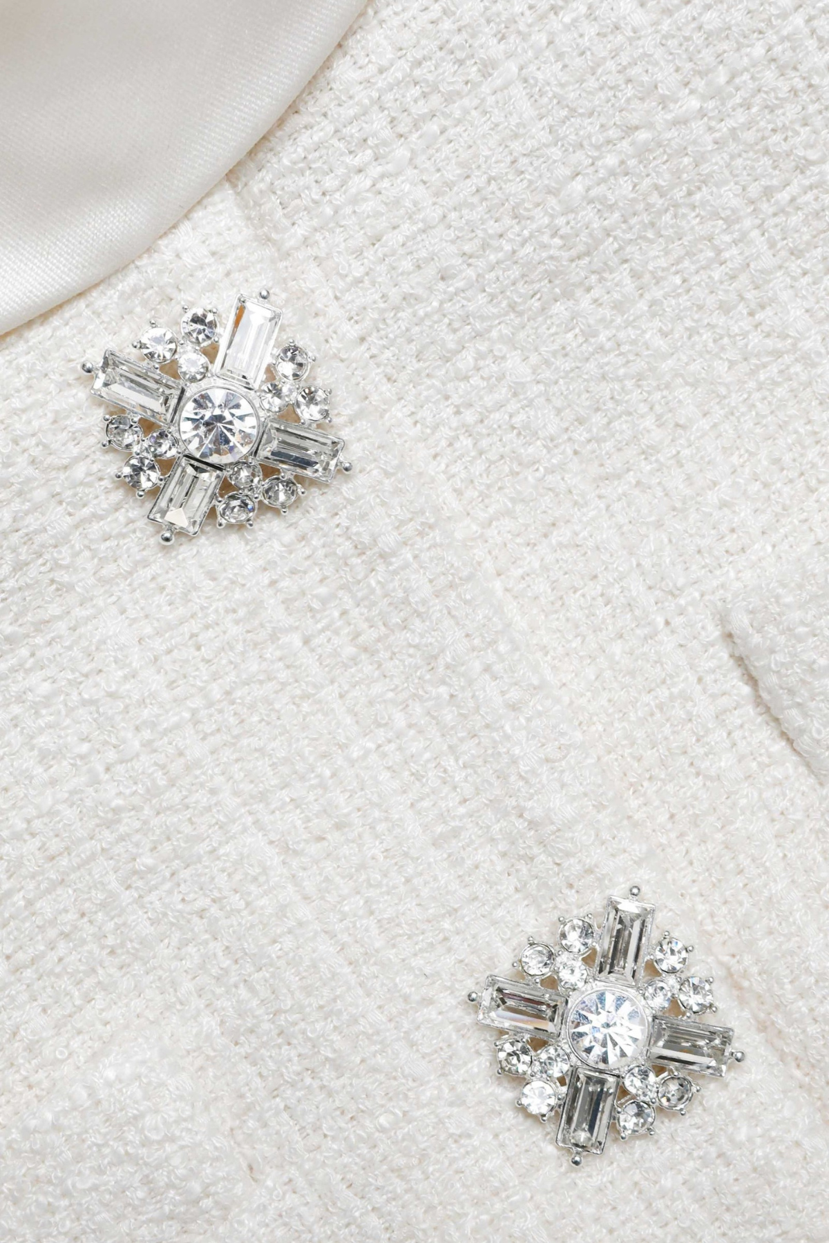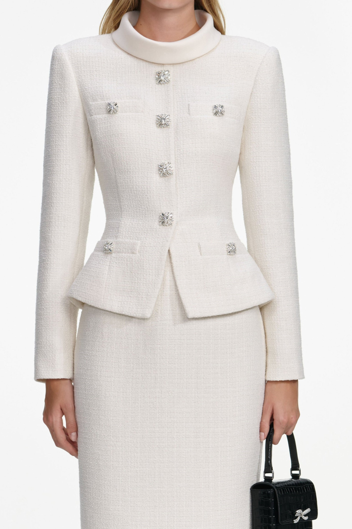 Elevate your wardrobe with this refined two-piece ensemble featuring a structured tweed blouse paired with a graceful midi skirt. The textured tweed fabric adds timeless elegance and visual interest, while the coordinated set ensures effortless styling. Perfect for professional settings, upscale casual occasions, or layered sophistication. The blouse's tailored silhouette complements the skirt's flowing length, creating a polished look that transitions seamlessly from day to evening. A versatile investment piece that embodies understated luxury and contemporary refinement.