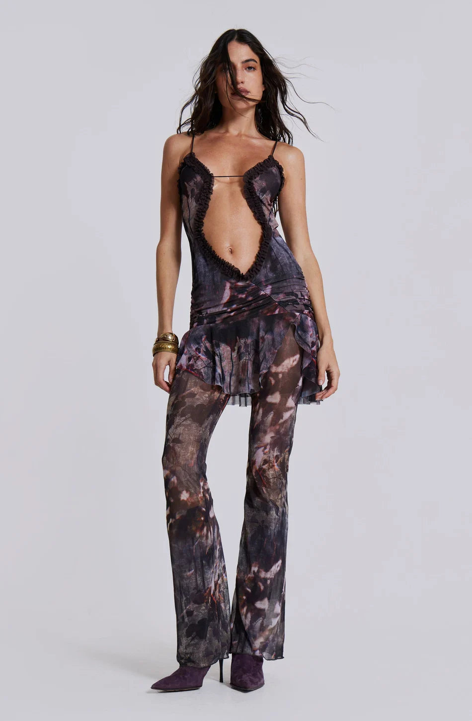 The Arianna Printed Mesh Mini Dress has been crafted from a lightweight powermesh fabric featuring an autumnal floral print. This mini-length dress features adjustable straps which can be worn as a halter neck or single shoulder. An extreme open neck cut-out, ruched side and front seams with a thigh-high split complete the look.Â