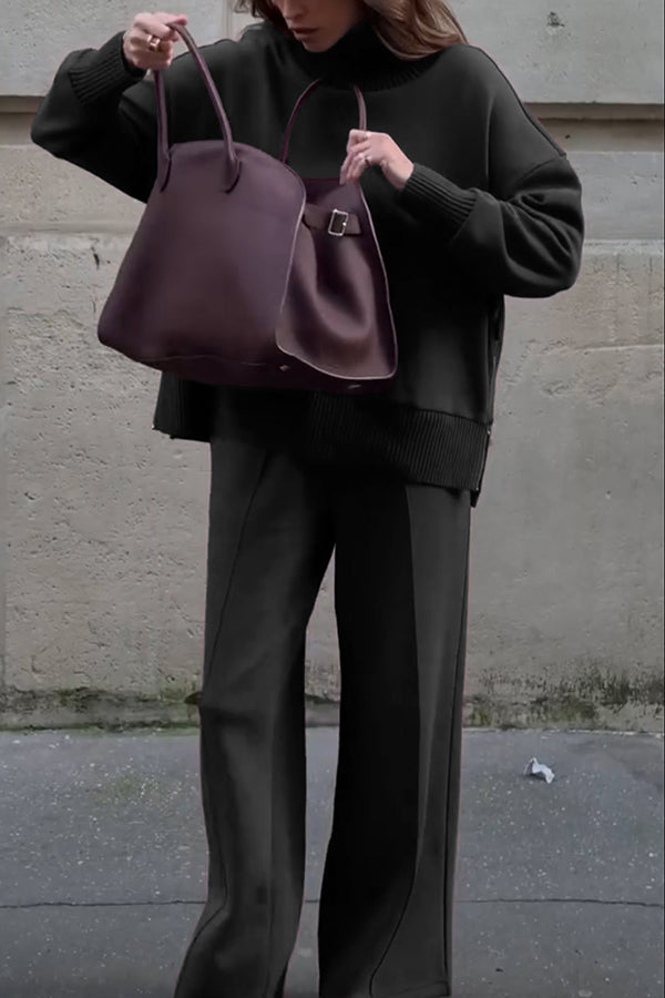 Double Soft Turtleneck Side Zipper Sweatshirt and Elastic Waist Pocketed Loose Pants Set