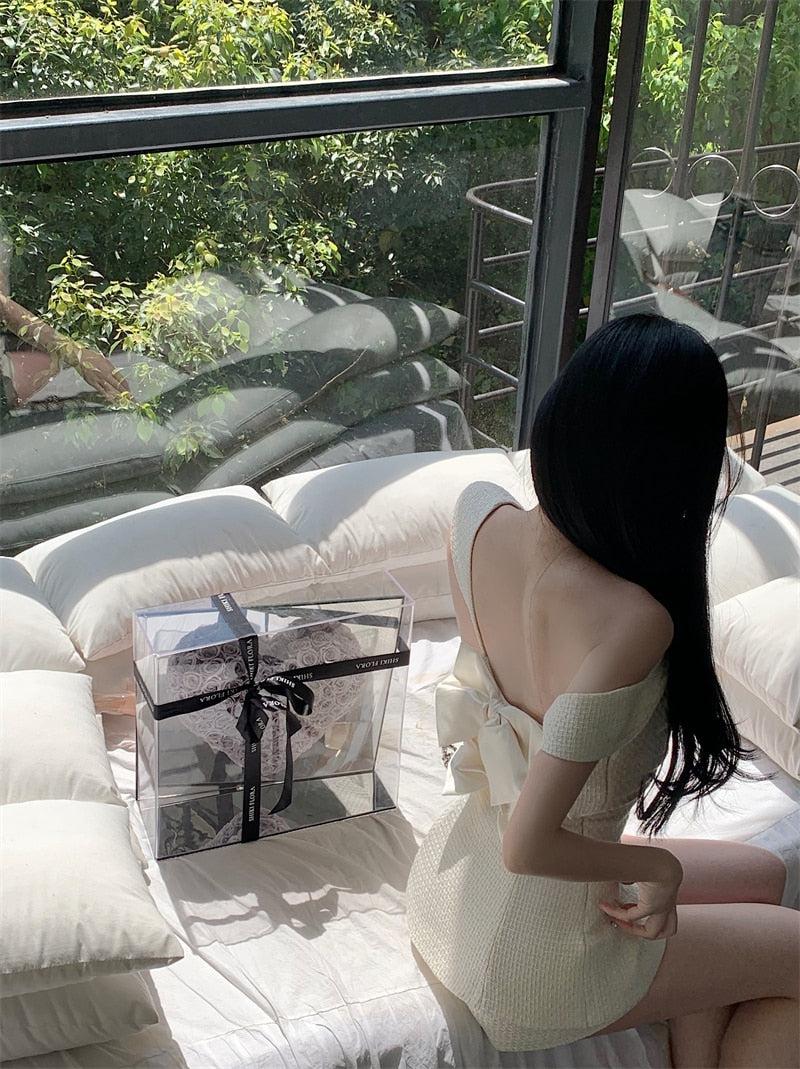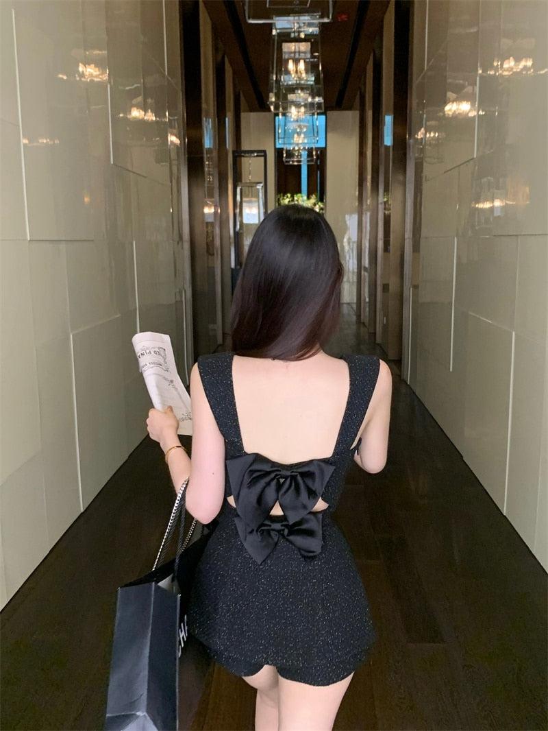 A two-piece set that captures the essence of the Barbiecore aesthetic with a twist. The ensemble includes a striped top adorned with diamond buckles and back ribbons. The top's movable straps and side zip offer adjustable comfort. Completing the set is a pair of shorts with a discreet back zip. Together. they create a mini dress look that is not only unique but also a stylish nod to the iconic Barbie aesthetic.