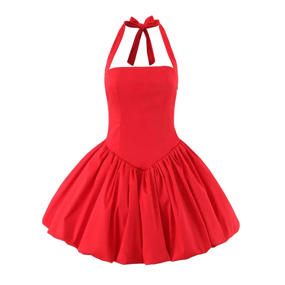 Bow Halter Slash Collar Lacing-Up Back Mini Dress