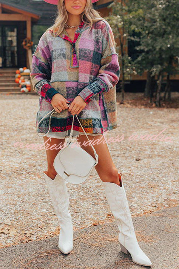 Brighten Up Your Day Hot Plaid Print Kangaroo Pocket Loose Hoodie