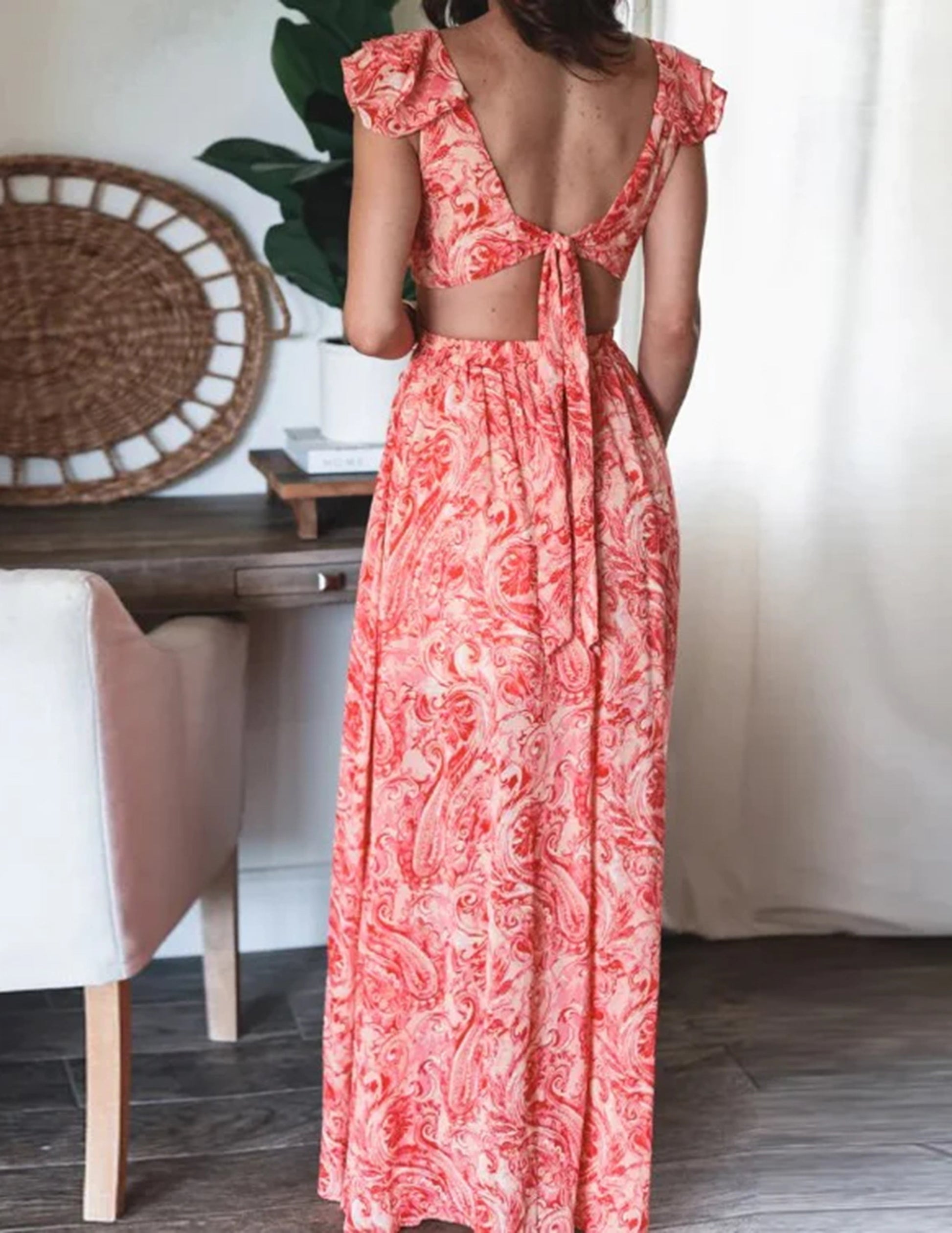 Designed to make a statement, this dress features delicate butterfly sleeves that gracefully drape over your shoulders, adding a touch of elegance to your look. The ruffled detailing along the neckline and hemline adds a playful and romantic flair, enhancing the overall feminine appeal of the dress.The vibrant print showcases a mesmerizing combination of colors and patterns, creating a captivating visual display. The intricate design adds a unique and artistic touch, making this dress a true standout in your wardrobe. Whether you're attending a garden party, a summer soir¨¦e, or a special occasion, this dress will ensure you stand out from the crowd