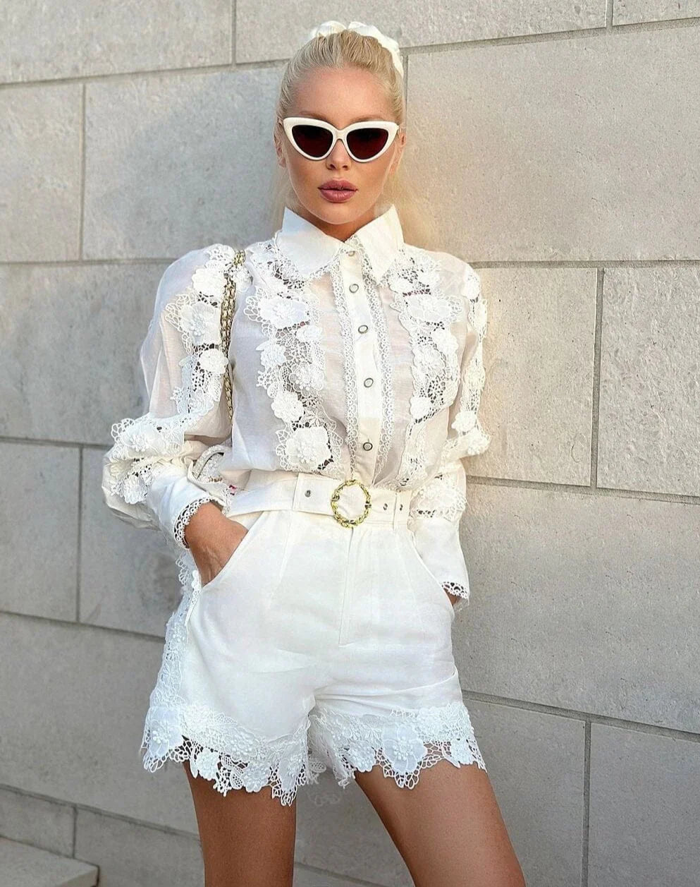 Unleash your feminine charm with the Carolina Two Piece set. Featuring a solid spliced lace design, this set includes a lapel long sleeve shirt and high waist loose shorts for a stylish look. The hollow out detail adds a touch of elegance, making it a perfect choice for any occasion.