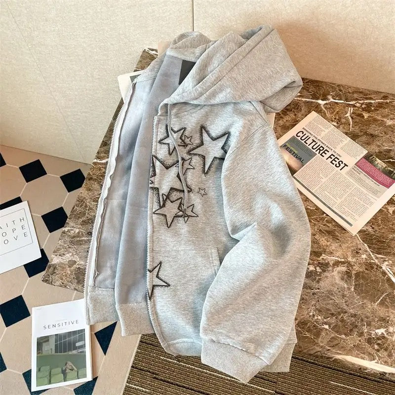 This hoodie features multiple stars of varying sizes, zip-up closure, kangaroo pockets and a drawstring design.