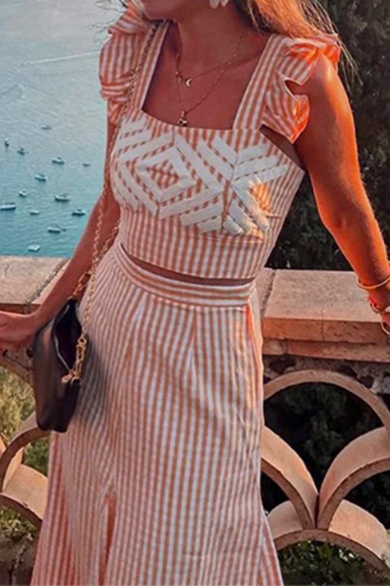 Casual Plaid Geometric Print Ruffle Patchwork Square Neck Two Pieces