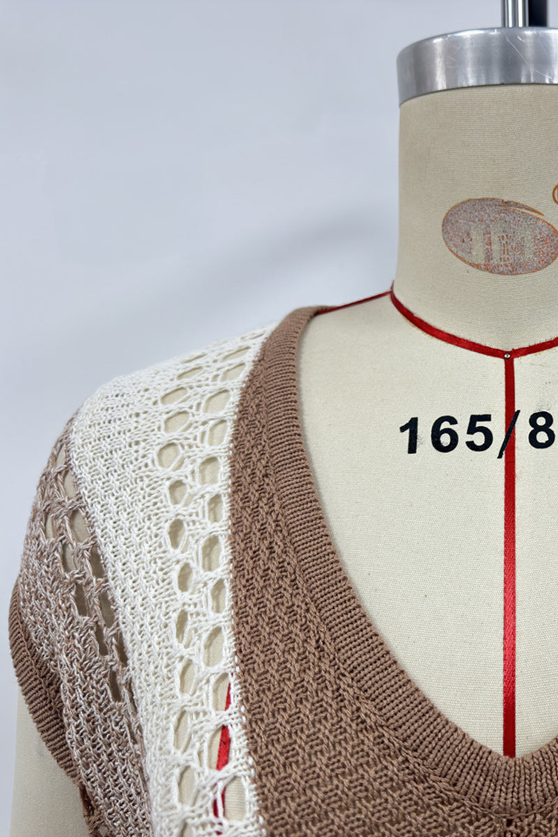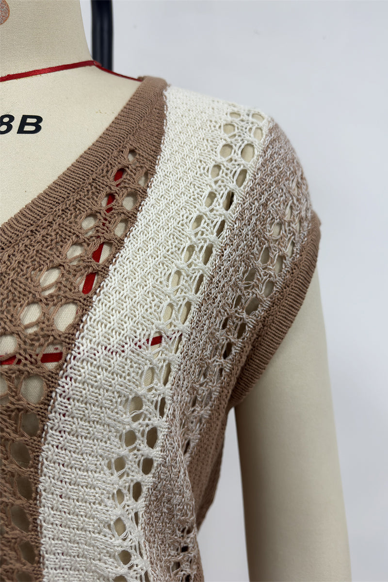 Casual Stripe Weave Contrast V Neck Short Sleeve Two Pieces