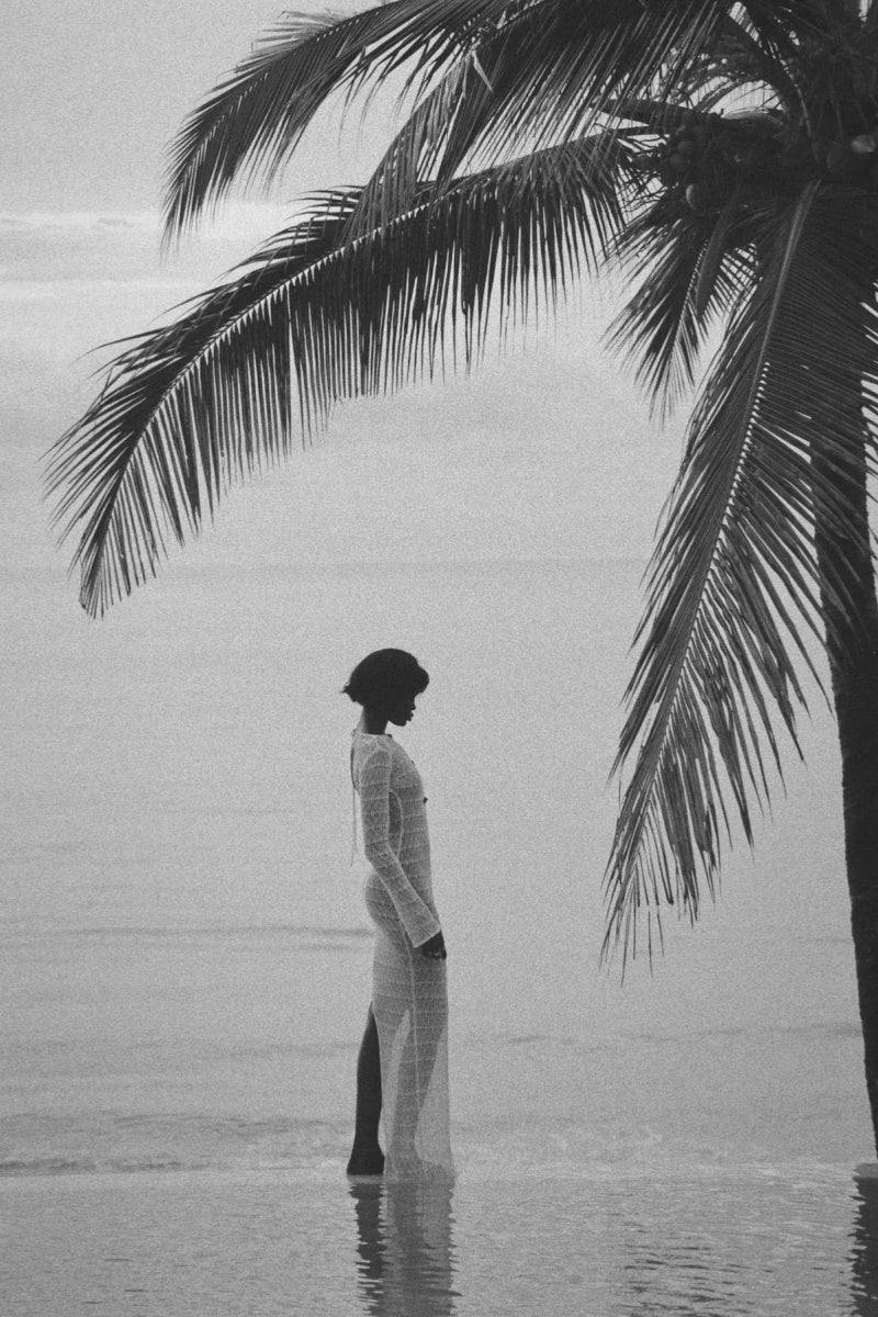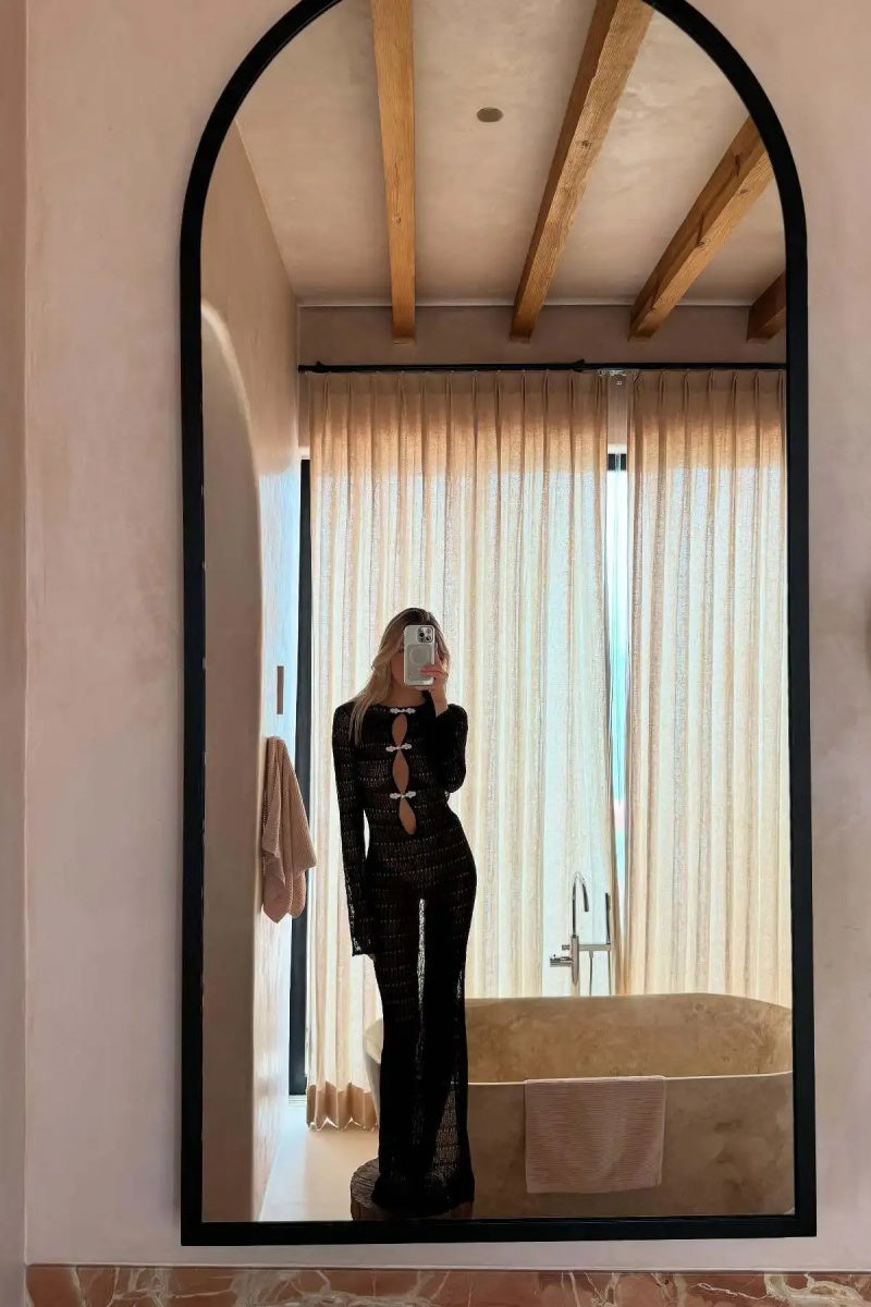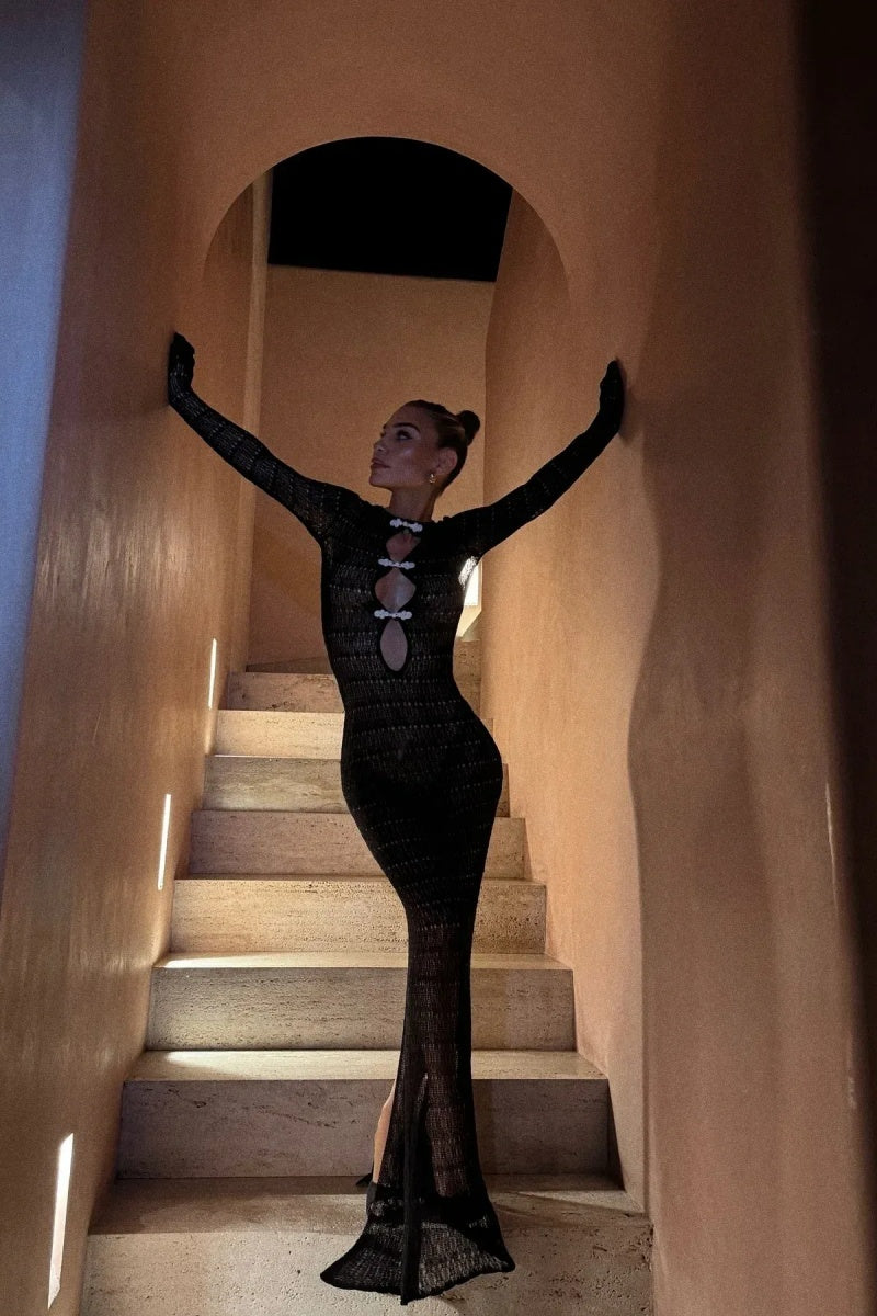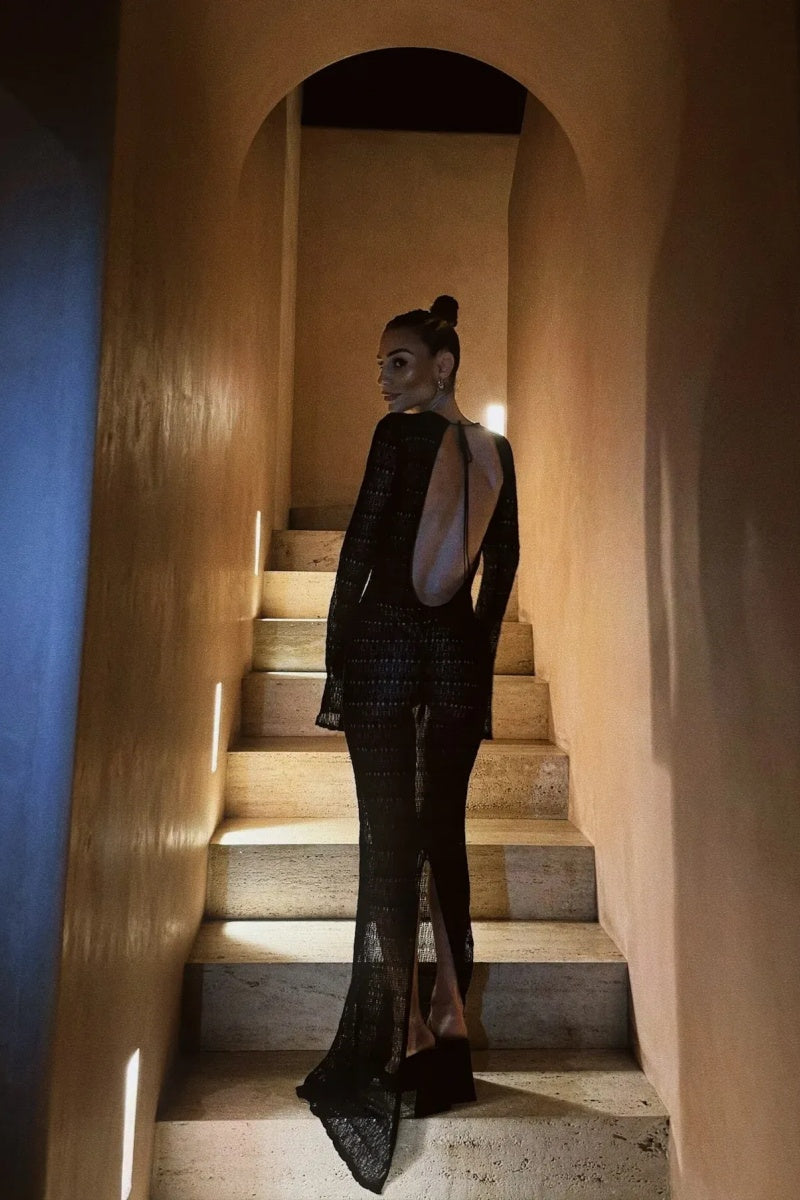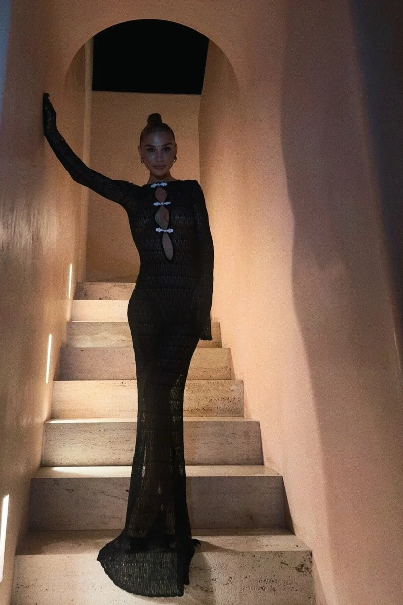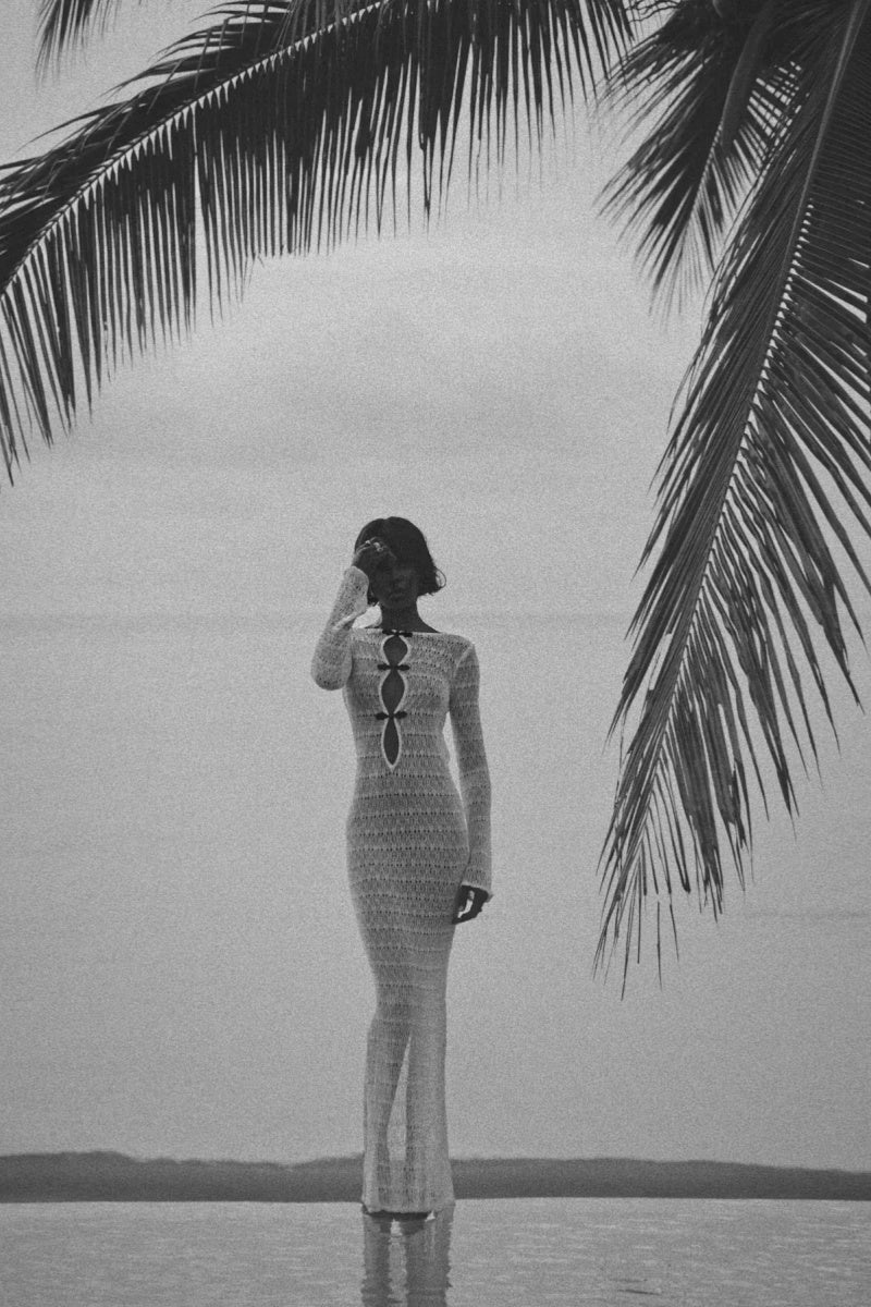This long-sleeved maxi dress, crafted from custom crochet, showcases timeless, handcrafted beauty through luxurious craftsmanship. Bold spiral trim contrasts with the delicate weave, giving the dress a striking visual dimension. A keyhole detail at the front adds subtle allure, while the open back accentuates the elegant, slender silhouette. Designed for the woman who appreciates artistry and sophistication, this dress effortlessly transitions from an intimate beachfront dinner to a glamorous evening event.