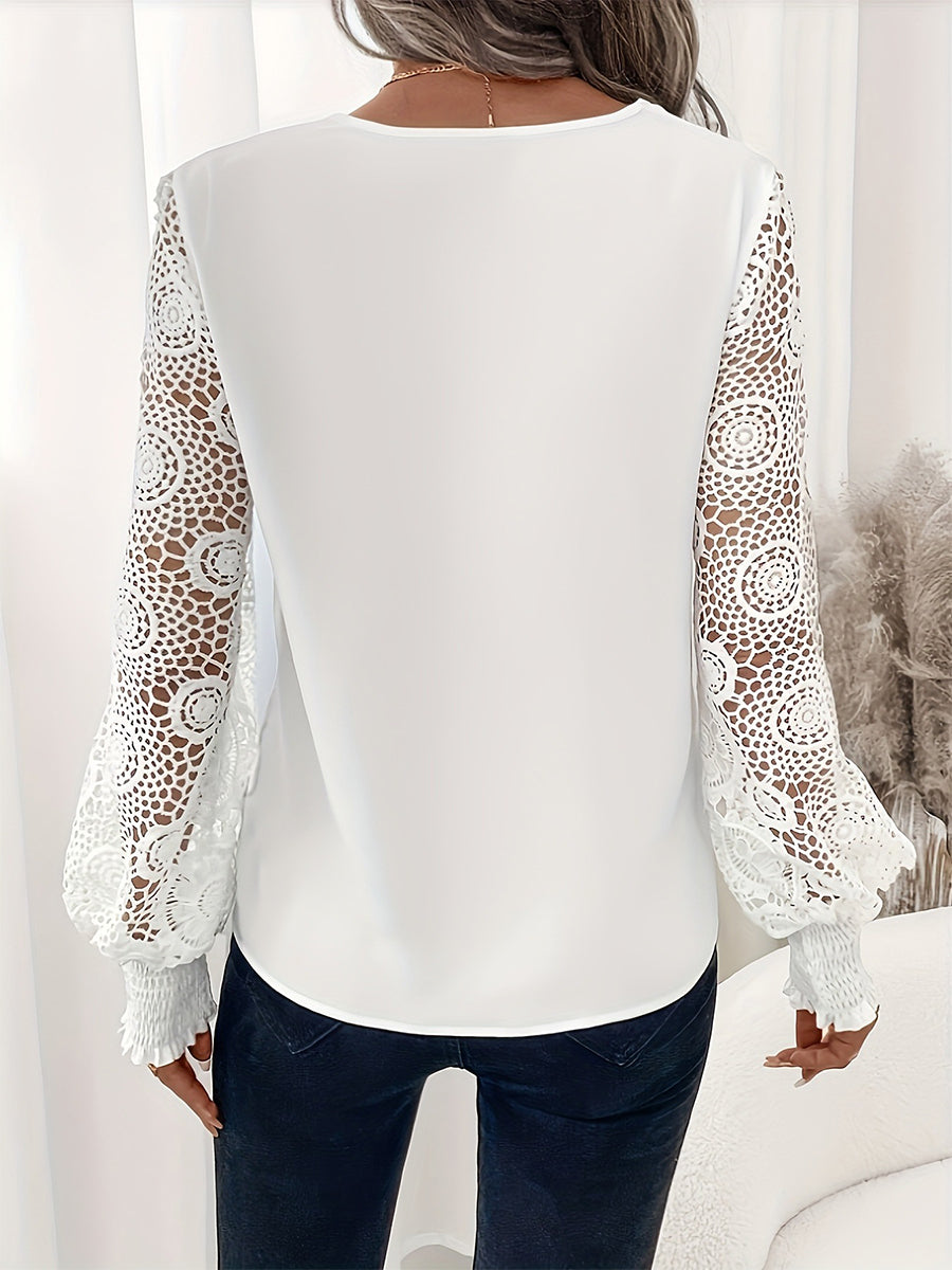 Daily Black V Neck Lantern Sleeve Long Sleeve Cut Out Elegant Contrast Lace Blouses