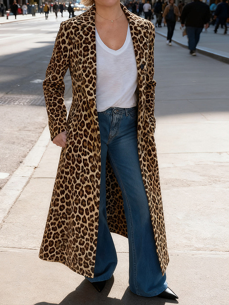 Daily Brown Leopard Turndown Collar Long Sleeve Pocket Casual Coat