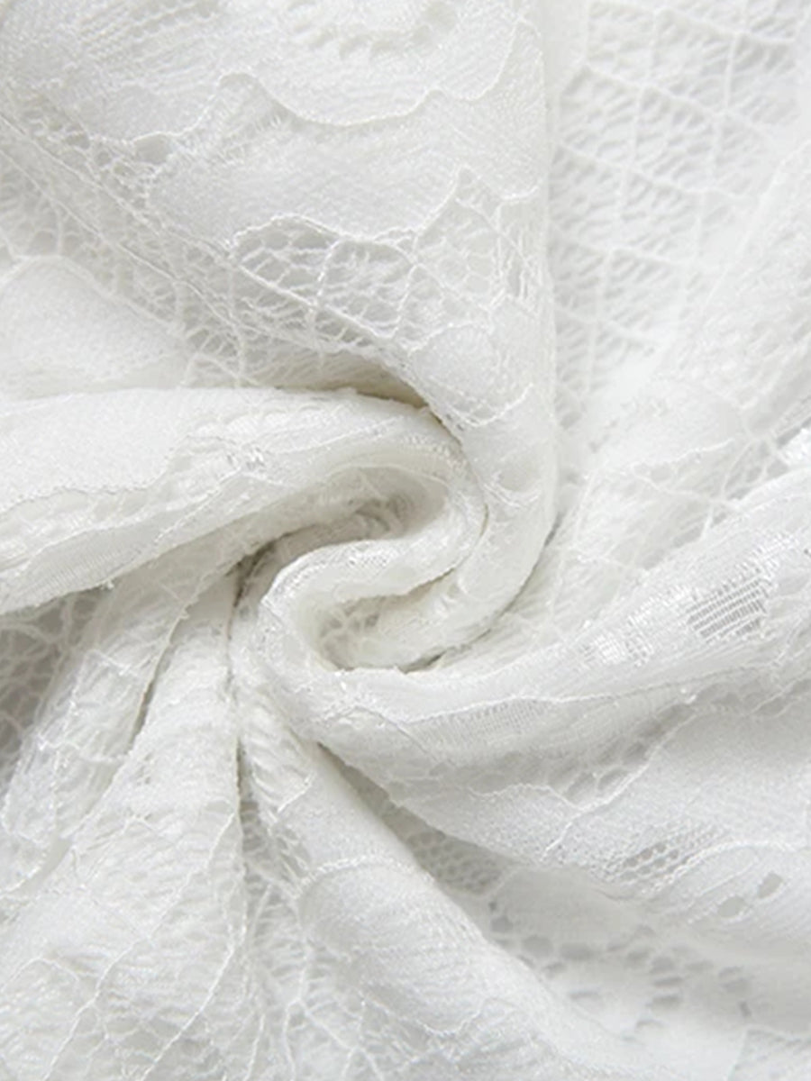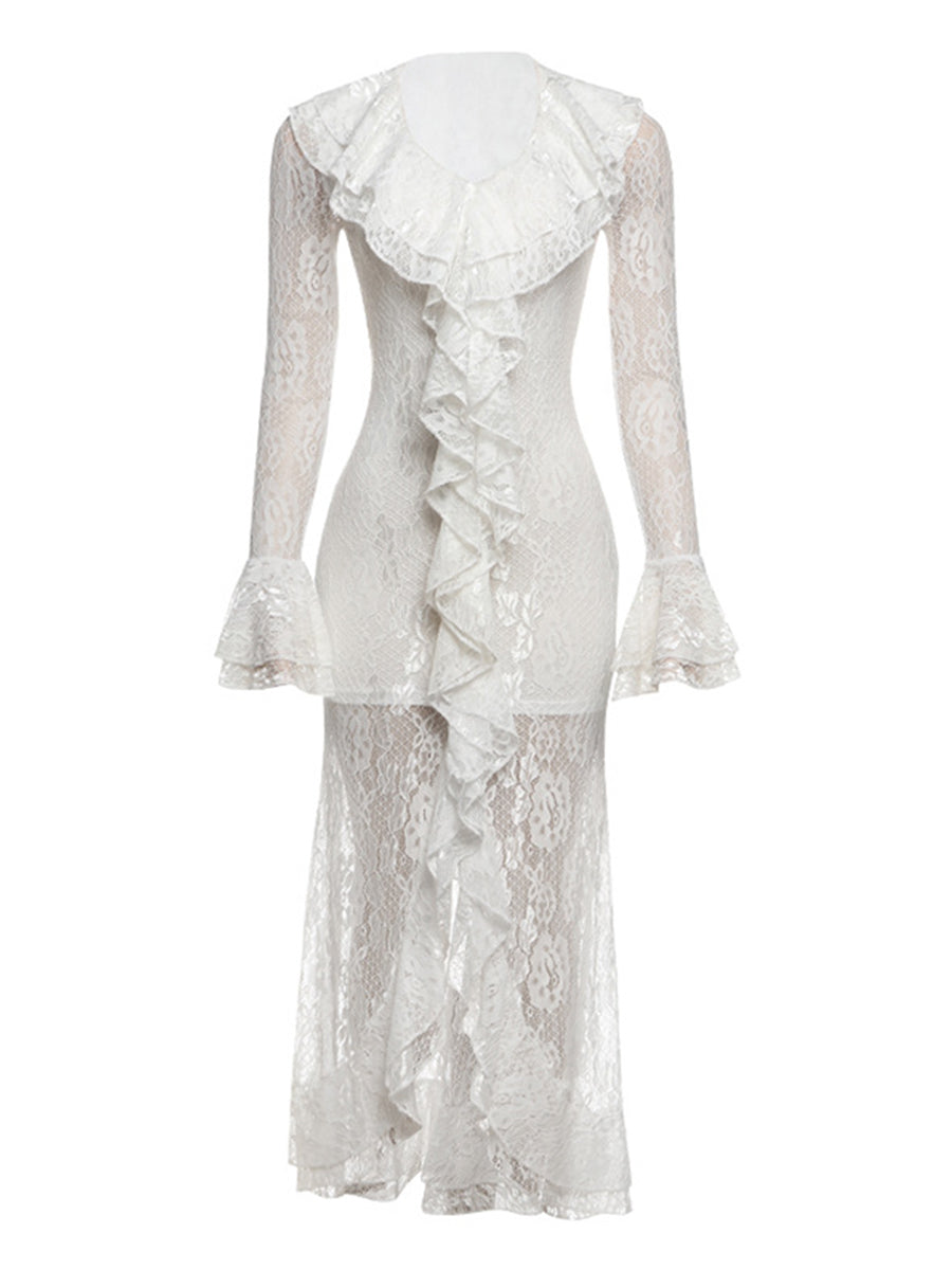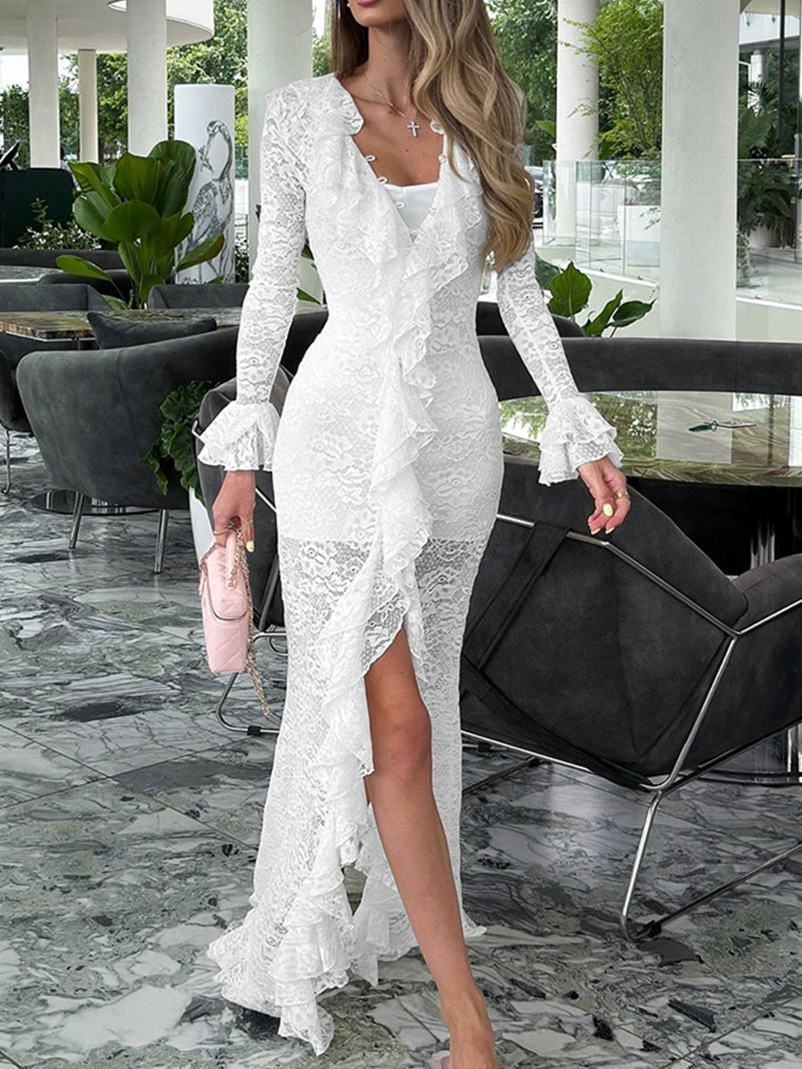 Daily White V Neck Long Sleeve Ruffle Casual Asymmetric Hem Lace Midi Dresses