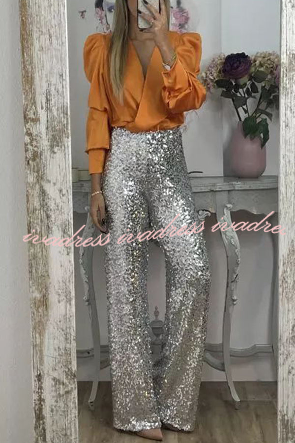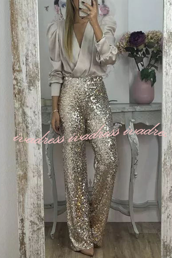 Glitzy Glamour Sequin High Rise Elastic Waist Wide Leg Pants