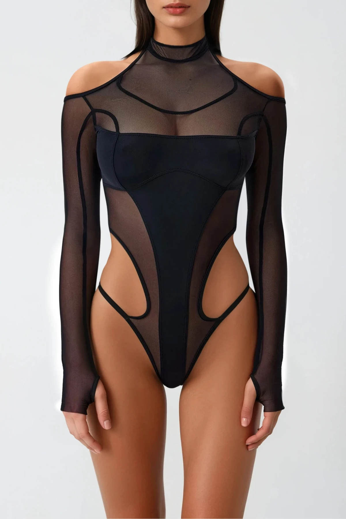 Engineered for modern sophistication, this mesh cutout bodysuit combines strategic sheer panels with a sleek silhouette. The carefully placed cutouts create visual interest while maintaining structure, making it versatile enough for layering under blazers or wearing as a statement piece. Crafted from quality mesh fabric, it offers a contemporary edge to any wardrobe. Perfect for those seeking bold, fashion-forward pieces that balance confidence with refined style.
