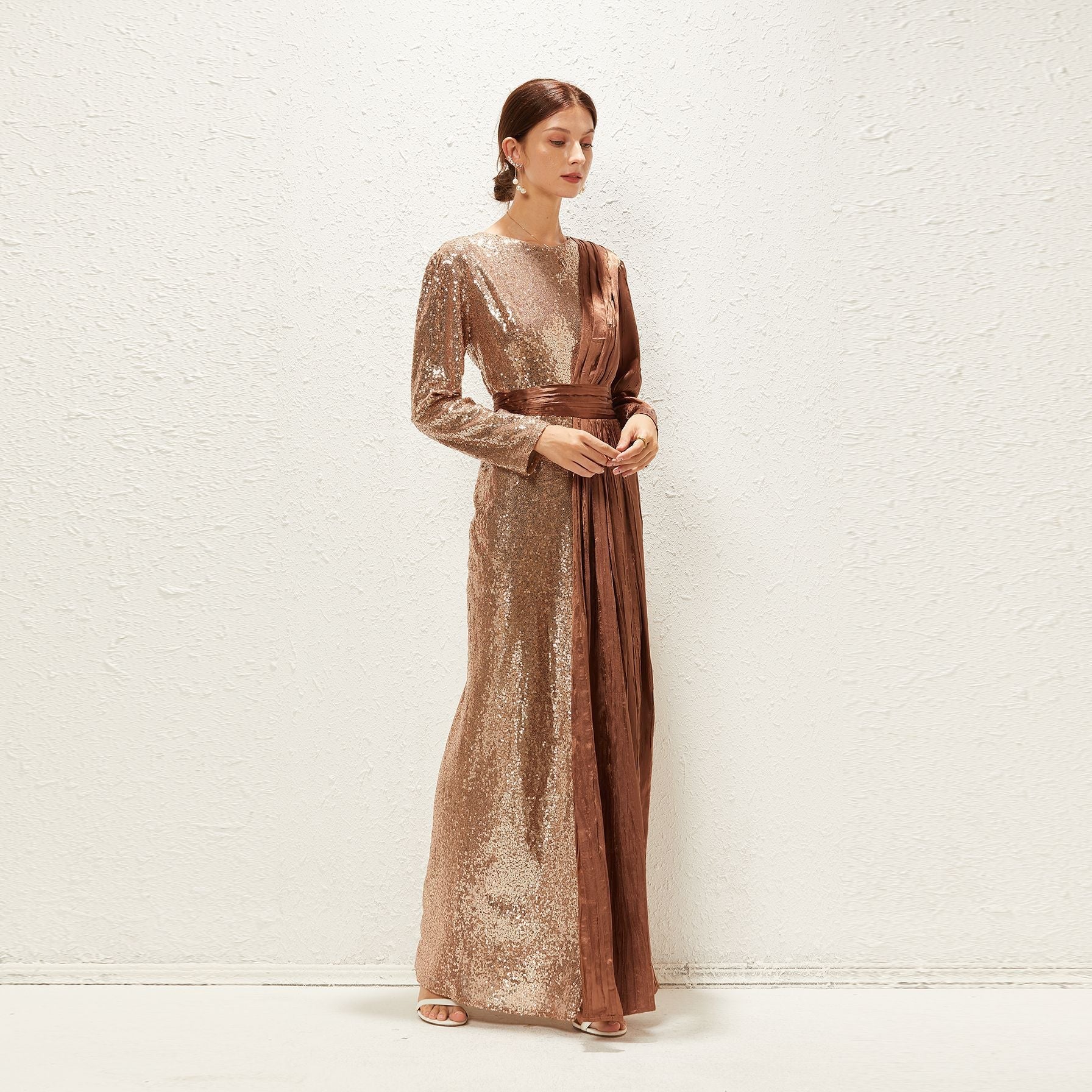 Elegant Embroidery Sequin Stitching Crumpled Satin Dubai Waist Trimming Maxi Dress Prom Formal Gown Maxi